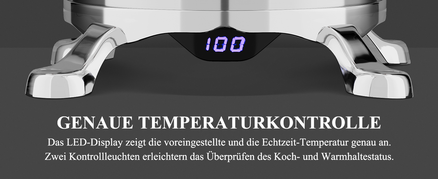 SMART BOIL & KEEP WARM FUNKTION: Der präzise Thermostat kann auf 5 Temperaturen eingestellt werden (75/85/90/95/100°C). Je nach gewählter Temperatur schaltet der Samowar nach dem Aufkochen des Wassers automatisch in den Warmhaltemodus um (außer bei 100°C), und die Warmhaltefunktion hält 6 Stunden lang an. Warmhaltetipp: Schalten Sie den Schalter aus, um die Warmhaltefunktion zu beenden.