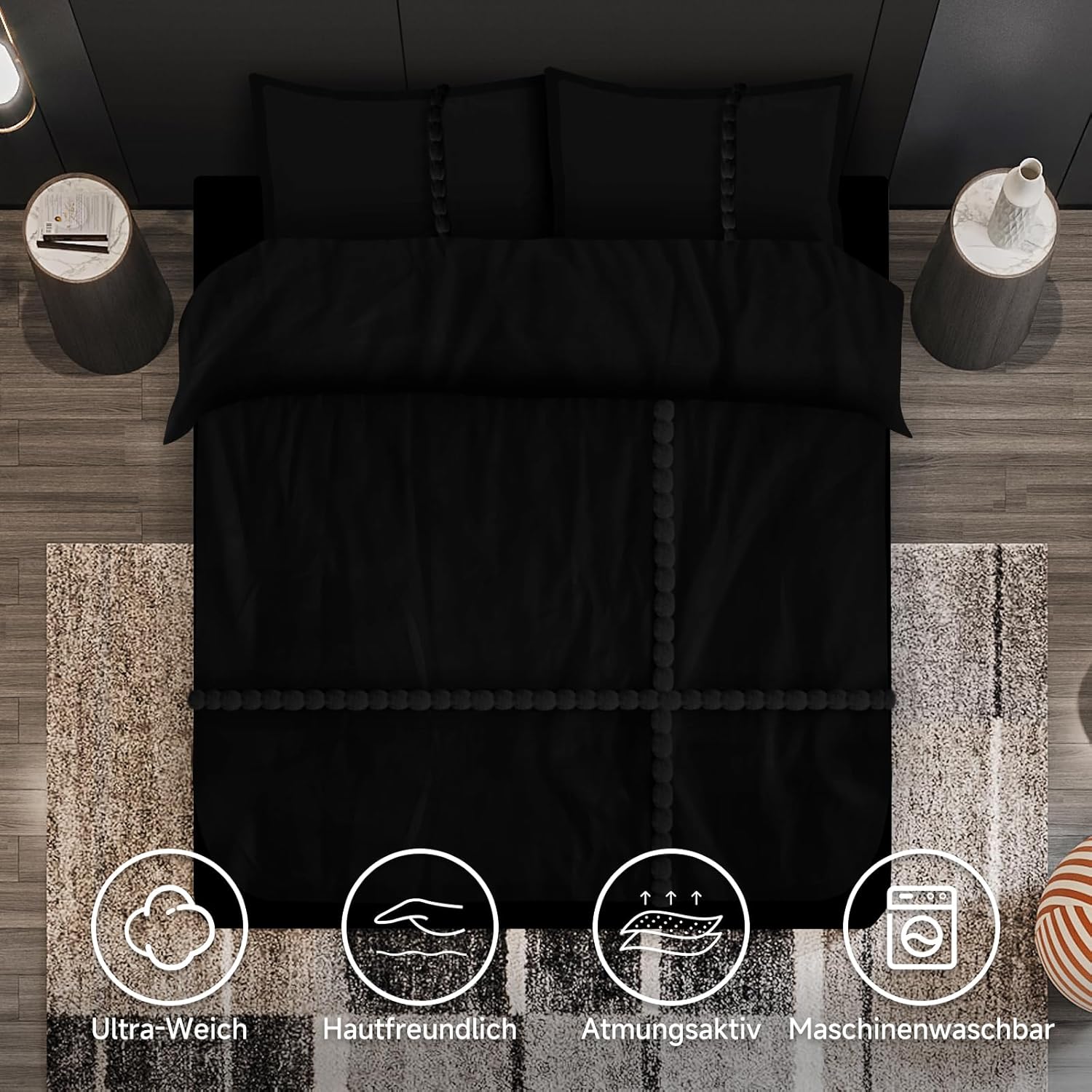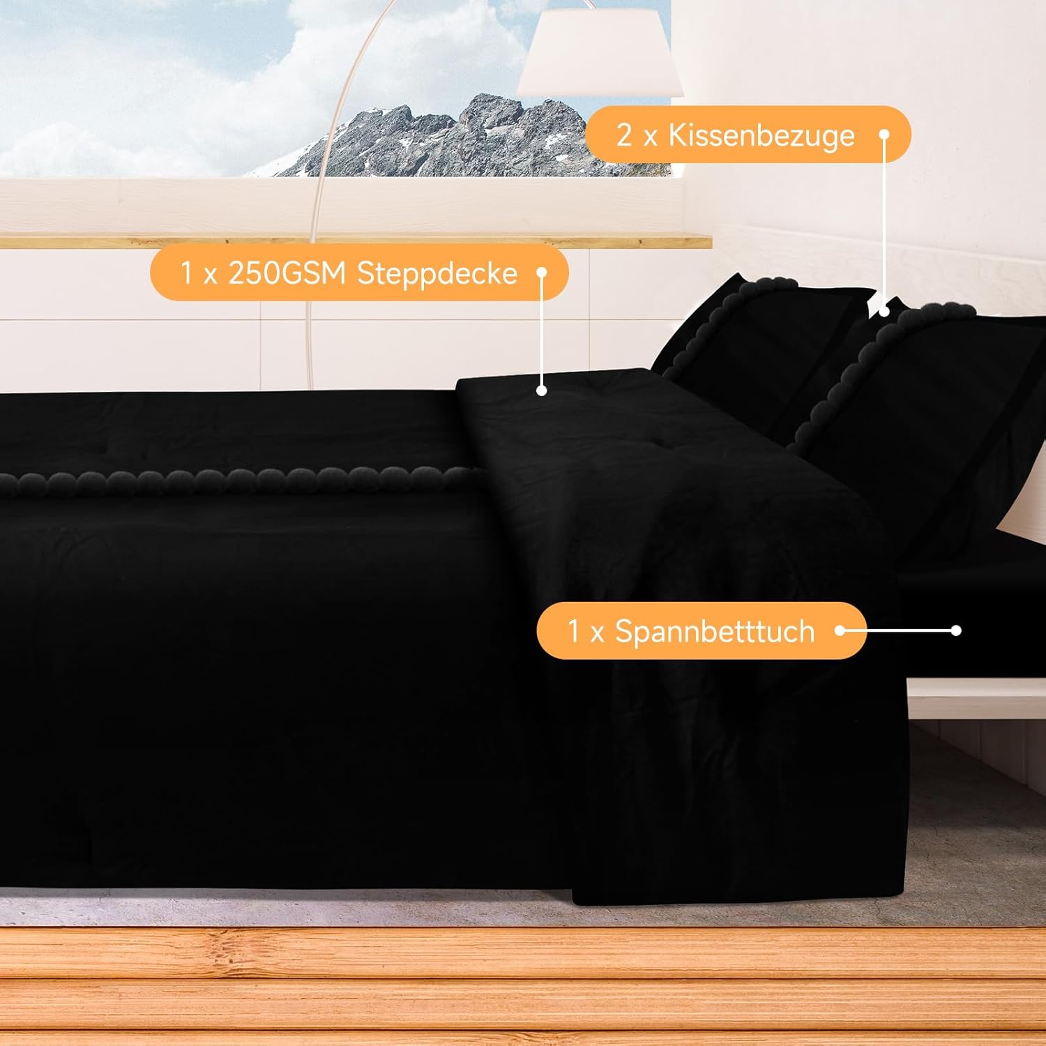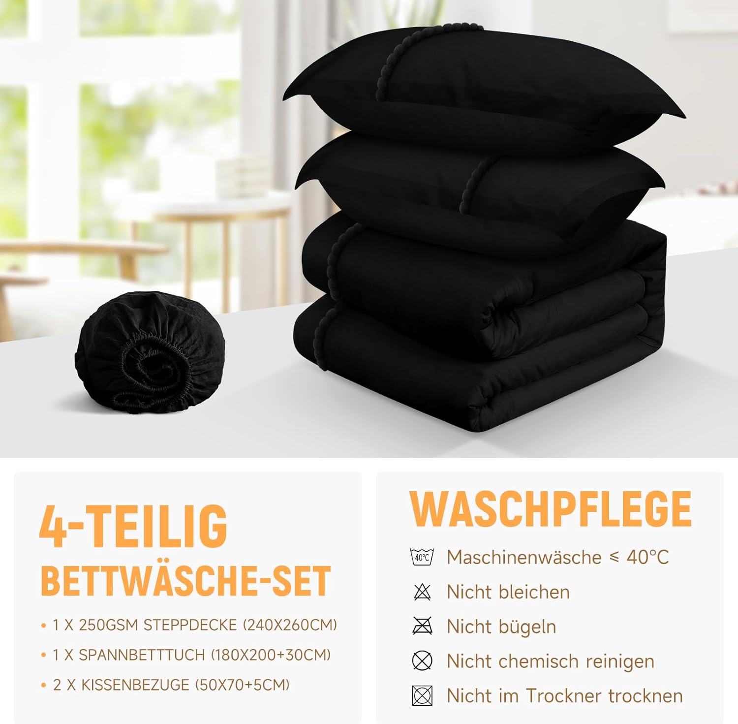 HOMELUX Bettwäsche 180x200 4teilig Schwarz, 240x260 Steppdecke mit 2 Kissenbezüge 50x70 cm, Bettwäsche Set mit Haarballen-Akzente, Aus Mikrofaser Bügelfrei & Knitterfrei(HL-4PCS08BS)