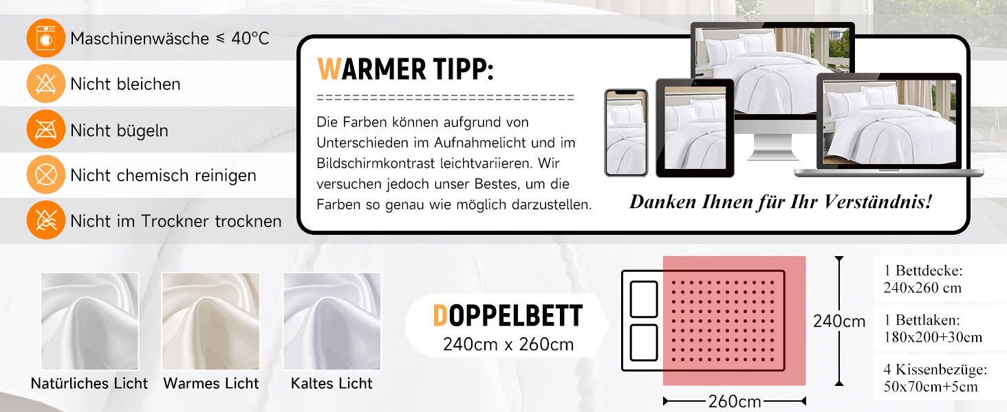 EINFACHE PFLEGE: Maschinenwaschbar bei 40°C spart Ihnen Zeit und Energie. Auf niedriger Stufe bügeln, um Falten zu entfernen, schonend waschen und auf niedriger Stufe im Trockner trocknen, nicht bleichen, nicht chemisch reinigen. Da die Steppdecke in einer vakuumversiegelten Verpackung verpackt ist, legen Sie sie bei der ersten Verwendung bitte ins Sonnenlicht und klopfen Sie sie sanft, damit sie flauschig wird.