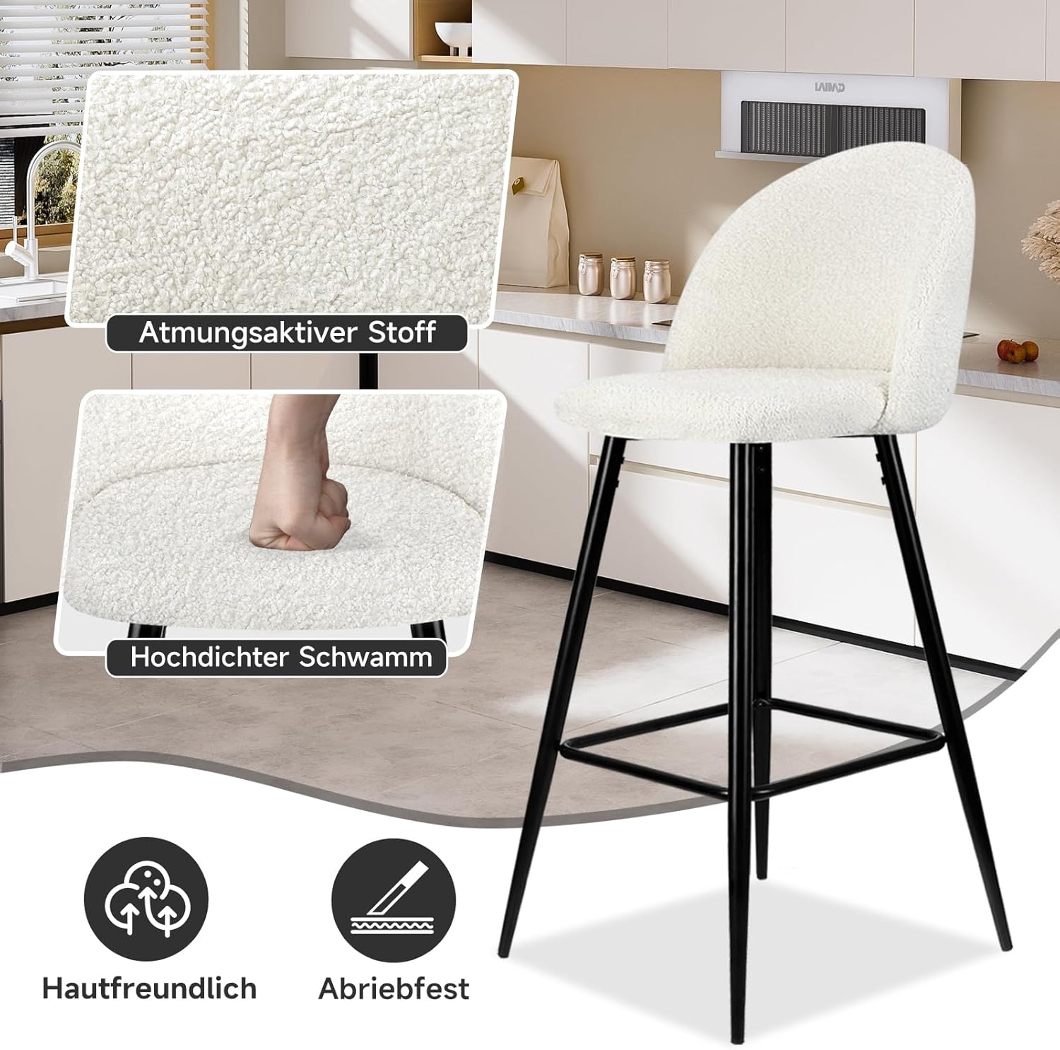 Hochwertiges Material: Die Kissen der Küchenstühle sind mit hochdichtem elastischem Schwamm gefüllt, sehr weich und atmungsaktiv. Das Stoffmaterial ist kratzfest und kann mit einem feuchten Handtuch in neuem Glanz gehalten werden. Die Sitze sind in 3 regulären Farben erhältlich (weiß, hellgrau, dunkelgrau), die voller Farbe sind und den visuellen Effekt verstärken, den Stil Ihres Hauses hervorheben und die Lebensqualität zeigen.