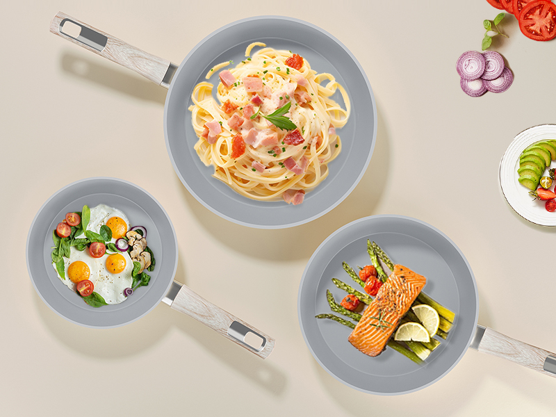 Enthält drei Pfannen (Ø 20 cm, 24 cm, 28 cm) für vielseitige Einsatzmöglichkeiten. Ob ein schnelles Frühstück, eine ausgewogene Mahlzeit oder ein ausgiebiges Familienessen – für jede Gelegenheit bestens ausgestattet.