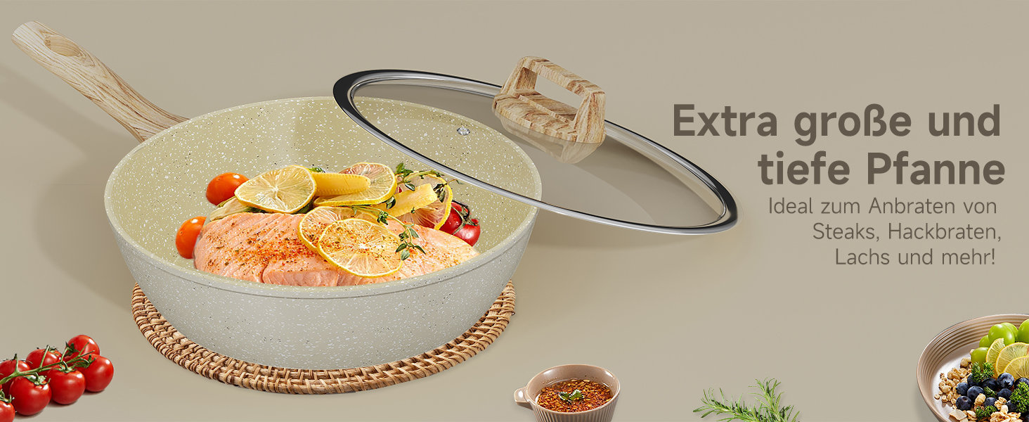 Der aus robustem Aluminium gefertigte Pfannenset induktion wird schnell und gleichmäßig erhitzt und sorgt so für effiziente und köstliche kulinarische Ergebnisse.
