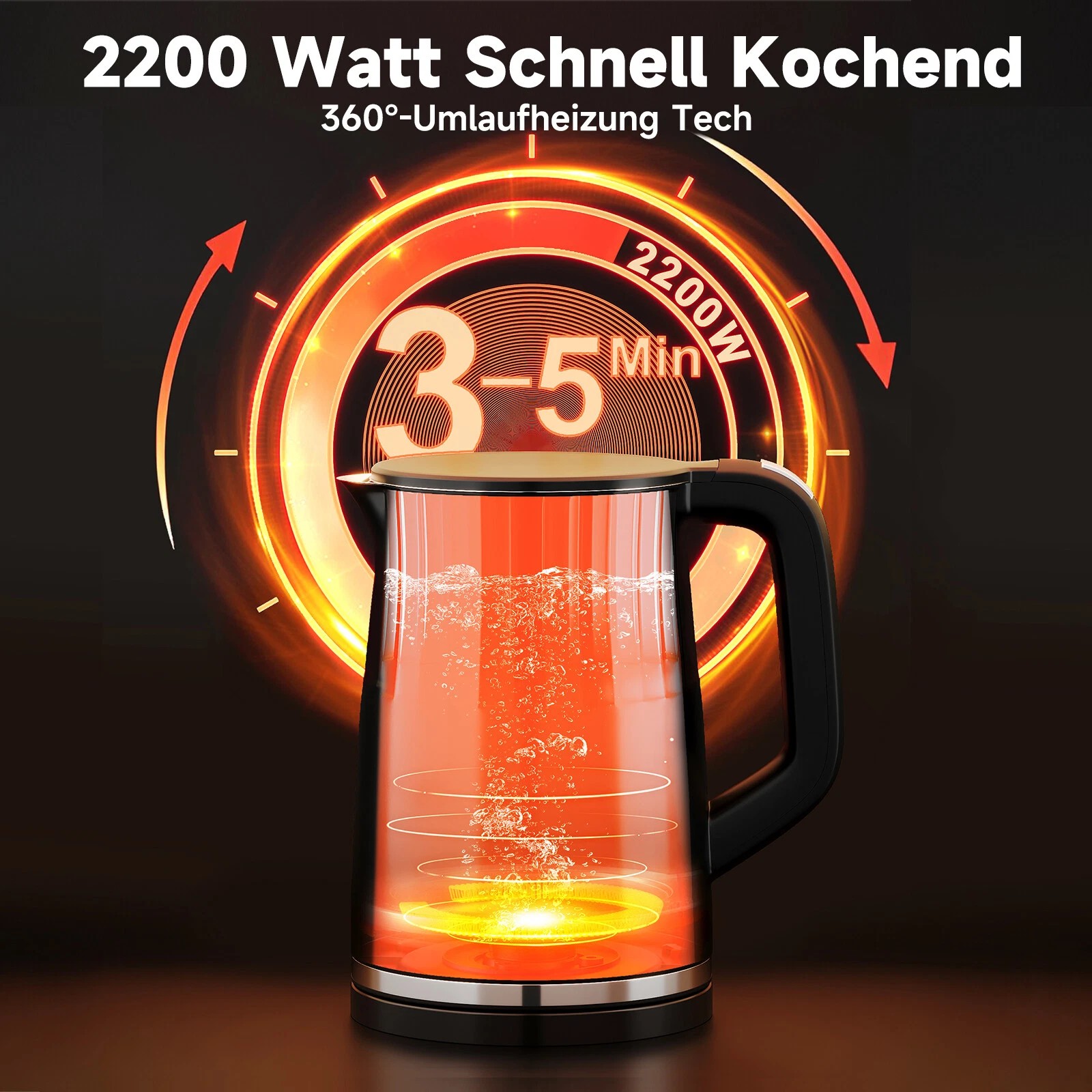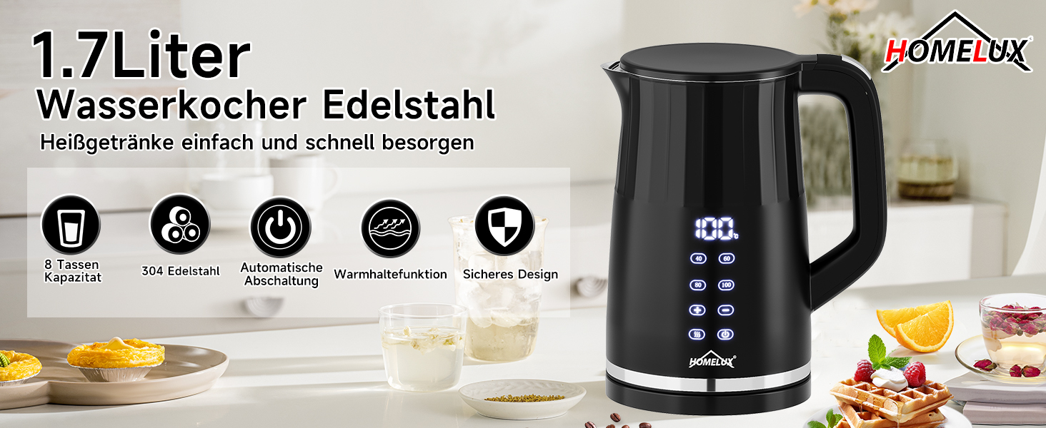Der 2200 Watt Wasserkocher heizt schnell auf und bringt einen Topf mit Wasser in wenigen Minuten zum Kochen. Das Fassungsvermögen von 1,7 Liter ist ideal für eine Familie mit 4 bis 6 Personen. Sie brauchen nicht lange zu warten, um heißen Tee, Kaffee, Müsli oder eine leckere Suppe zu kochen.