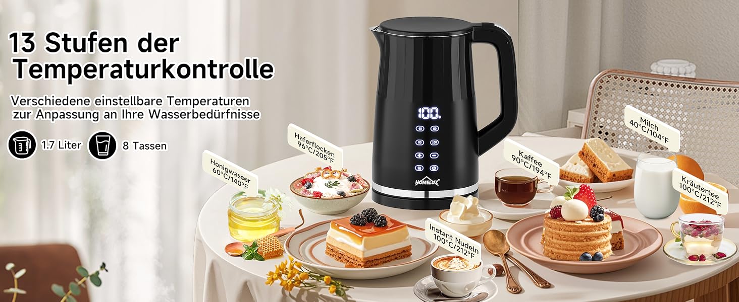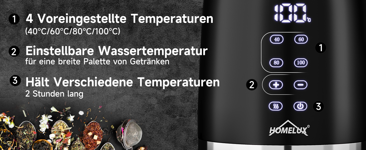 Das Wasser wird auf die gewünschte Temperatur erhitzt und kann bis zu 120 Minuten warmgehalten werden. Ideal für Teeaufgüsse mit F