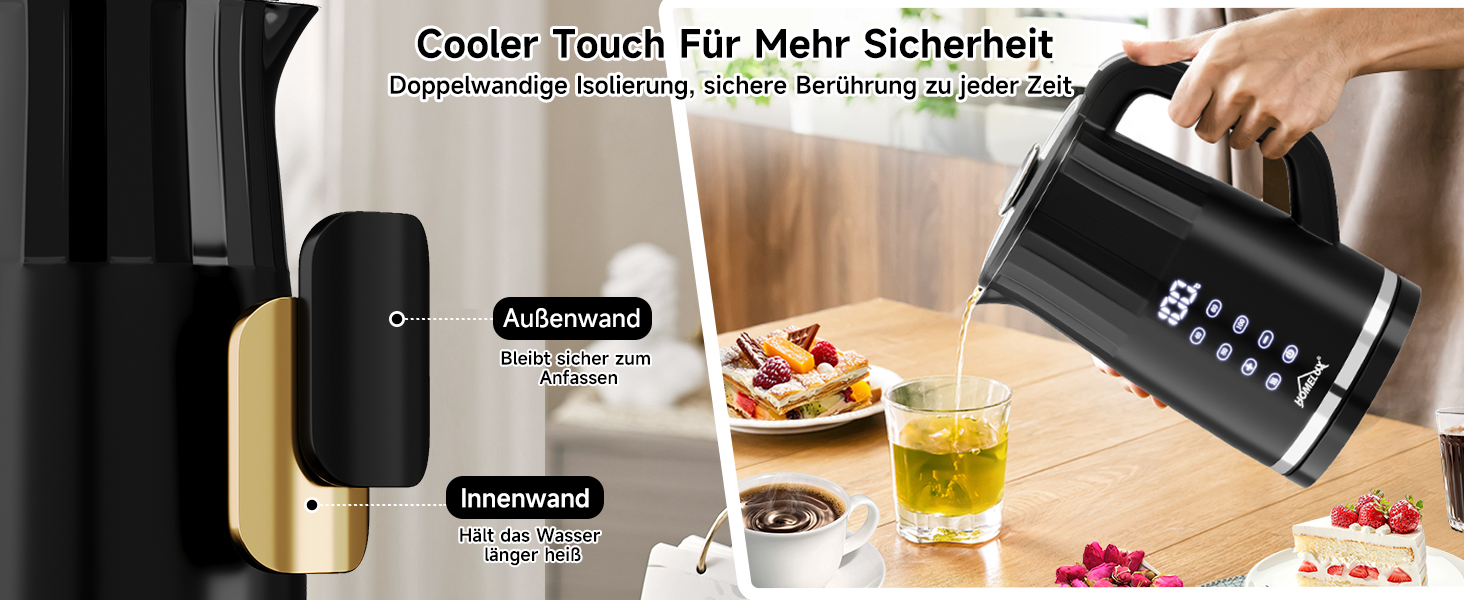 Das hitzeisolierende Doppelwandgehäuse sorgt dafür, dass der Kocher außen nur handwarm wird. Innen besteht er aus lebensmittelechtem SUS 304 Edelstahl, der geruchs- und geschmacksneutral für reinsten Wassergenuss sorgt. Das ins Gehäuse eingelassene LED-Touch-Display zeigt die aktuelle Wassertemperatur in Echtzeit und ermöglicht so punktgenaues Aufkochen. Erleben Sie Wasserkochen so komfortabel wie nie zuvor!