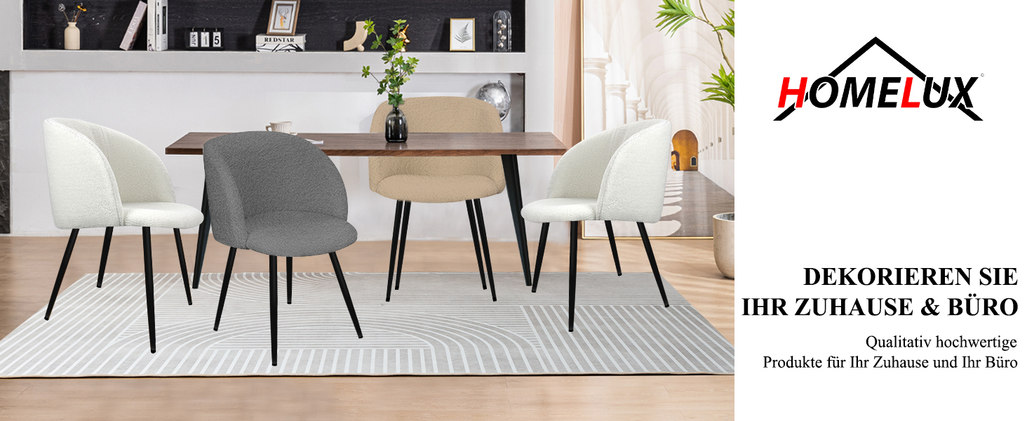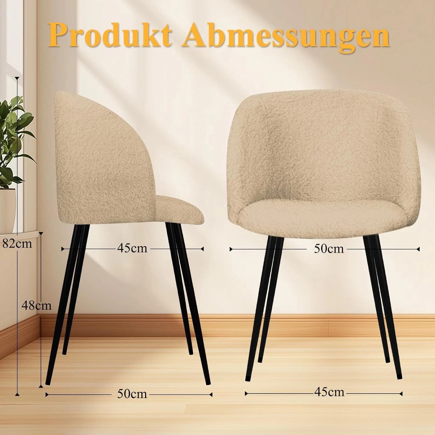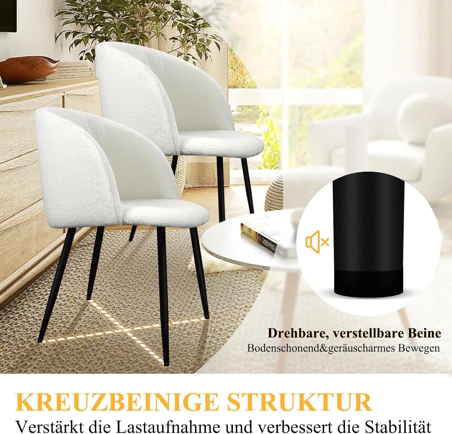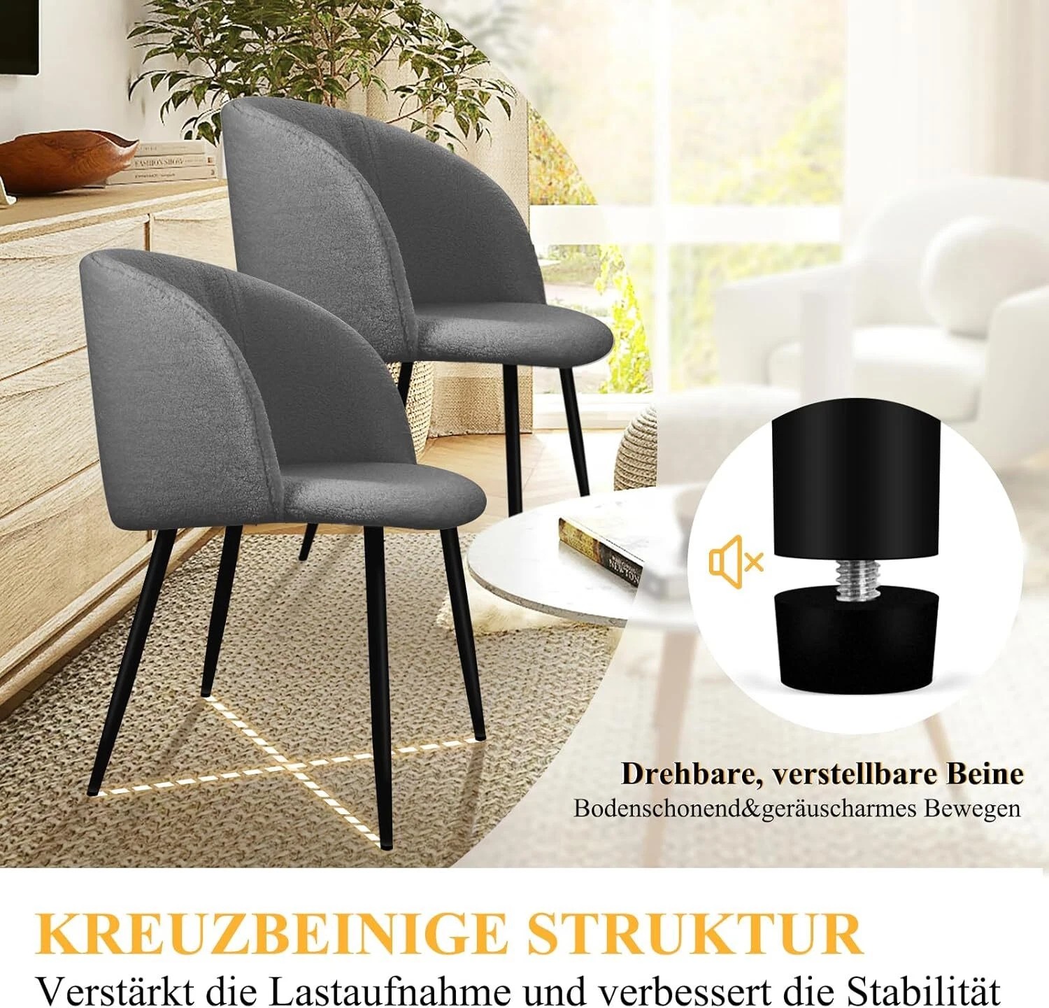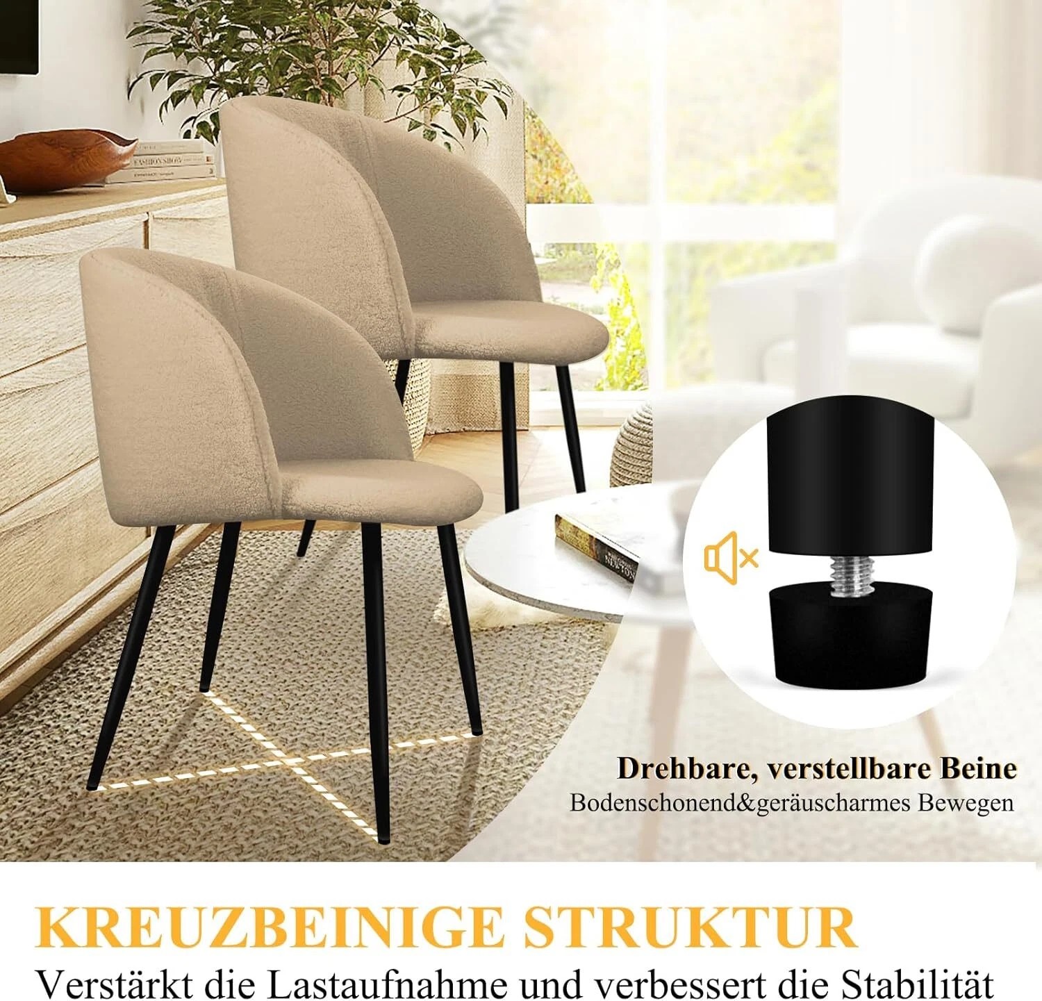 Die Beine dieses Esszimmerstuhls sind aus hochwertigem Metall gefertigt. Die gekreuzten Metallbeine und das dicke Rahmen machen den Küchenstuhl sehr stabil und langlebig. Der Stuhl hat eine statische Tragkraft von 110 kg.Die Unterseite der Stuhlbeine ist mit dicken Anti-Kratz-Füßen ausgestattet. Die abgerundeten Ecken des Stuhls haben ein glattes Design, um versehentliche Kollisionen während des Gebrauchs zu verhindern.