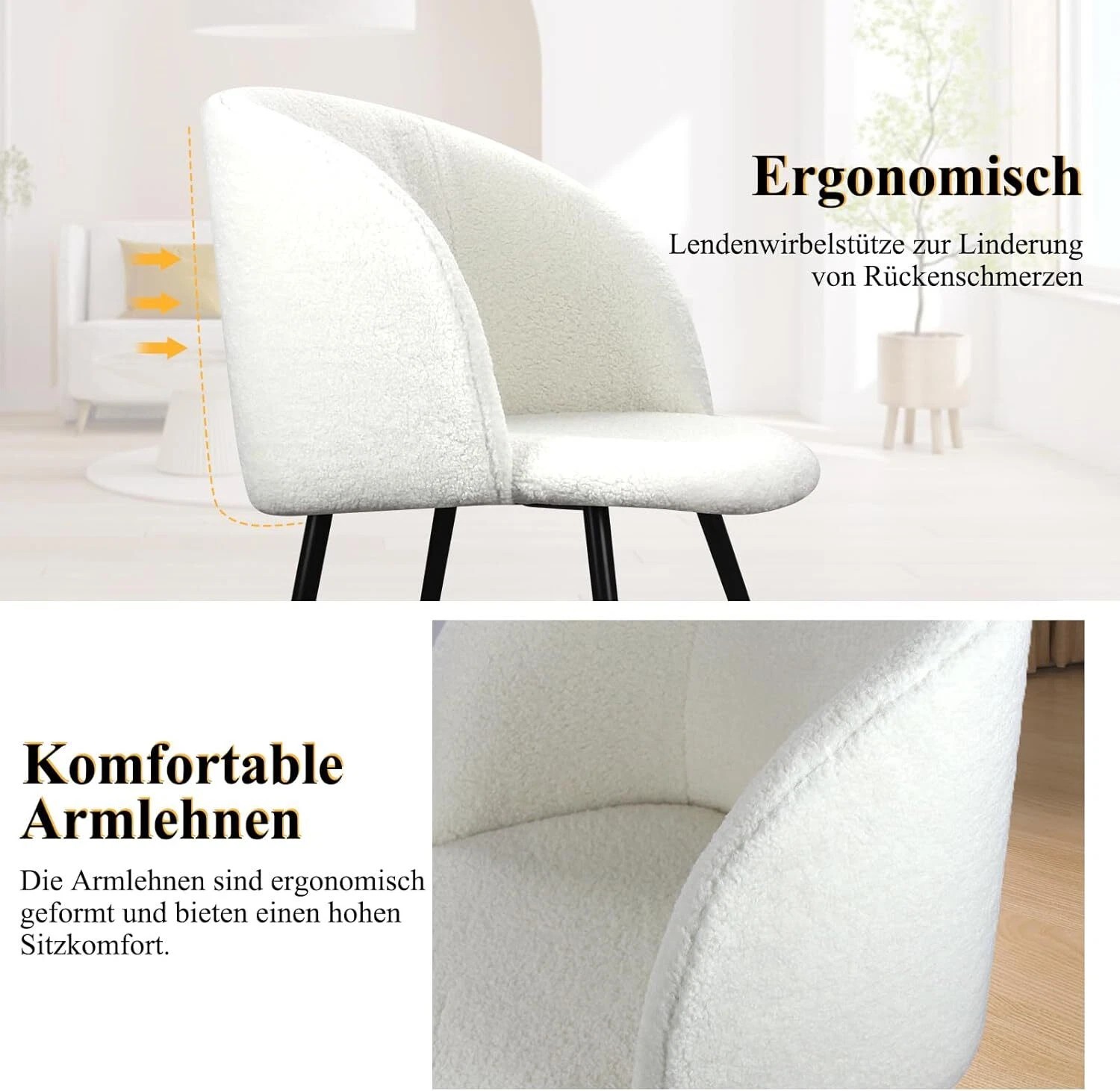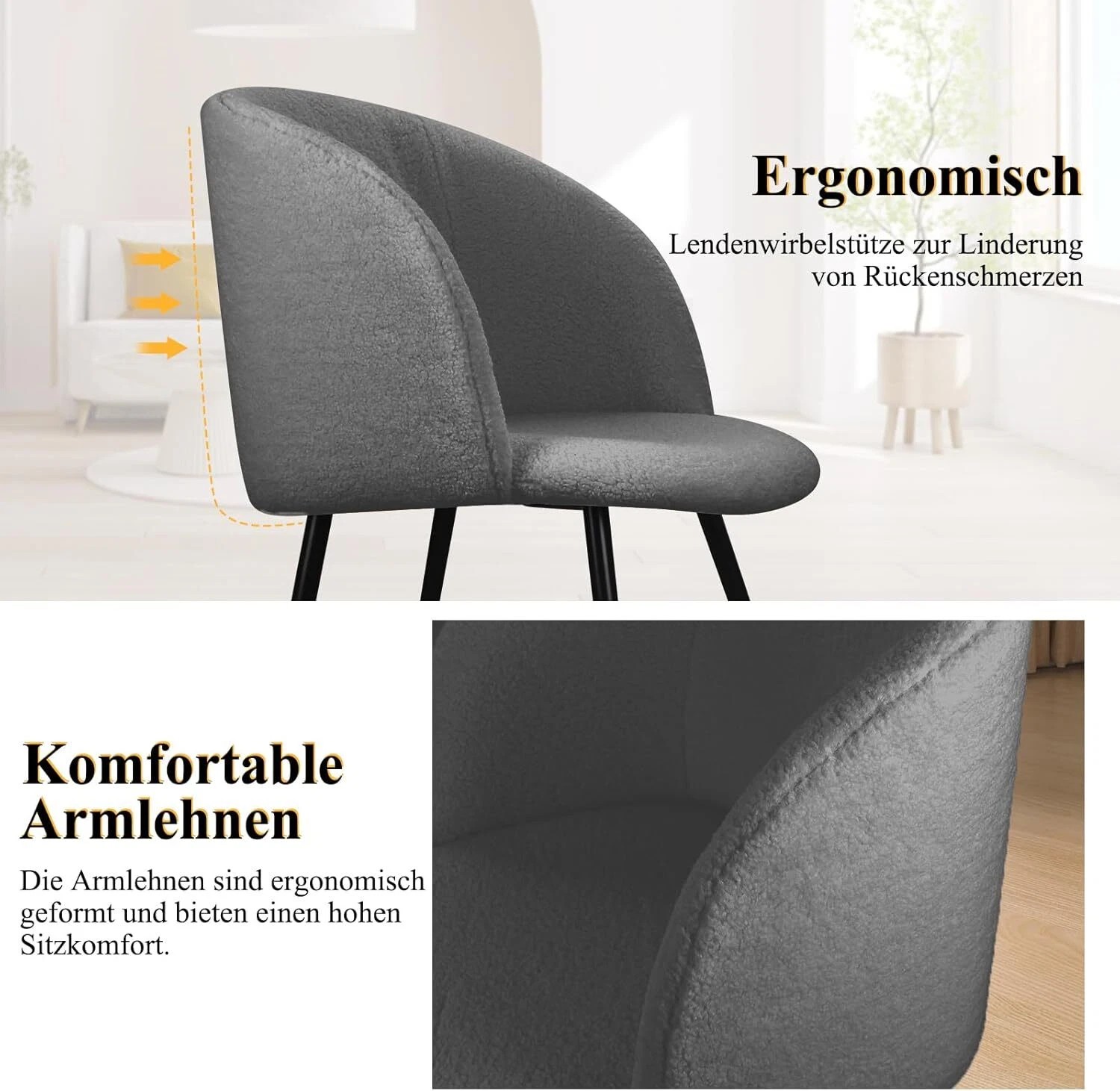 Dieser moderne Esszimmerstuhl ist ergonomisch gestaltet. Das breite und umhüllende Design der geschwungenen Rückenlehne, die angemessene Höhe der Armlehne sind so aufeinander abgestimmt, dass sie Ihrem Körper beim langen Sitzen mehr Haltgeben. Mit dem Esszimmerstuhl können Sie sich entspannen.