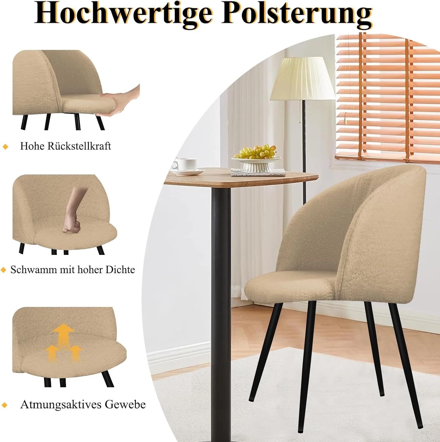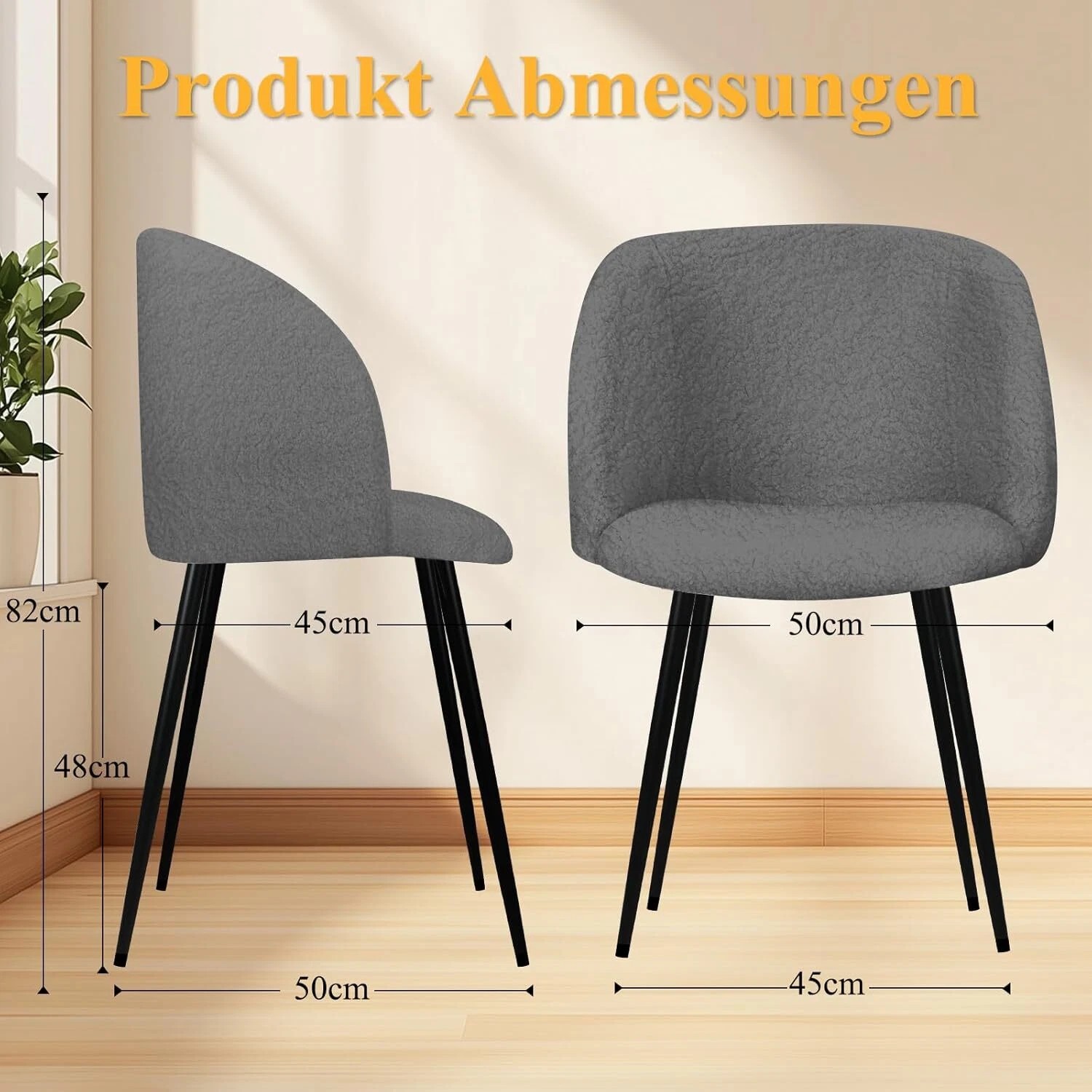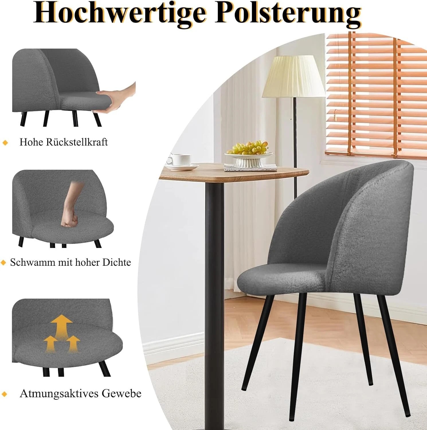 Wählen Sie aus drei eleganten Farben, um diese Küchenstühle nahtlos in Ihre Wohnkultur zu integrieren. Das minimalistische Design der Esszimmerstühle mit einem mattschwarzen Metallrahmen und luxuriösem, weichem Stoff ergänzt jede Einrichtung – von modernem Stadtstil bis hin zum klassischen Landhausstil.