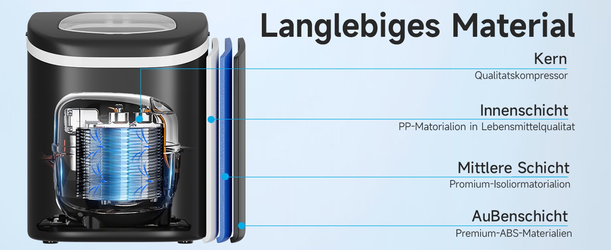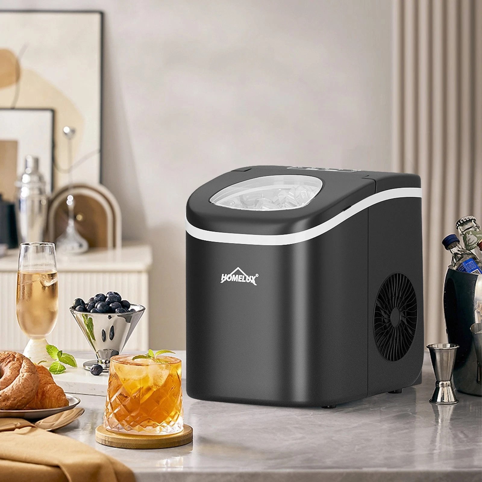 Die tragbare Eiswürfelmaschine von Homelux präsentiert sich in einem vielseitigen und kompakten Design mit den Maßen 26(T)*22(B)*28,5(H) cm. Der stabile Griff ermöglicht mühelosen Transport mit nur einer Hand. Ideal für verschiedene Anlässe, wie Küchengebrauch, zu Hause, beim Campen, auf Wohnmobilreisen und bei Partys, bietet dieser Eiswürfelbereiter jederzeit und überall Eisgenuss.