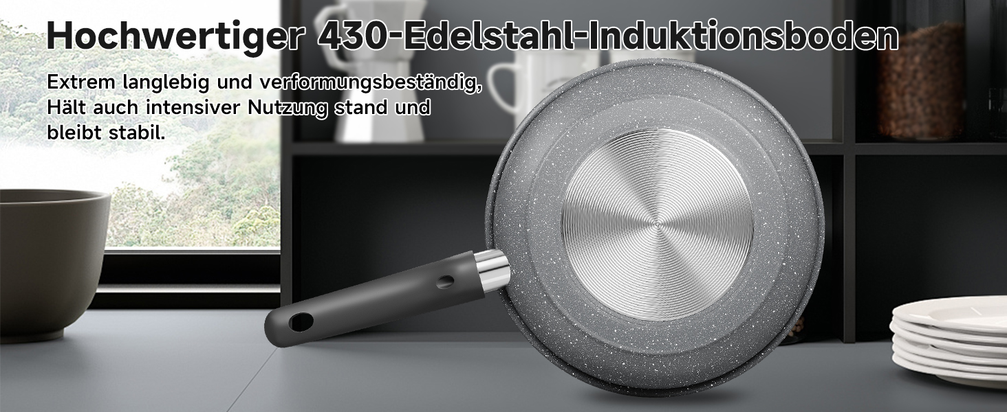 Pfannenset aus kaltgewalztem Stahl mit doppellagiger Hitzeschutz-Beschichtung und einem Induktionsboden aus rostfreiem 430er Edelstahl sorgt das Pfannenset für optimale Hitzeverteilung und Wärmespeicherung. So erzielen Sie perfekte Bratergebnisse mit minimalem Energieeinsatz.
