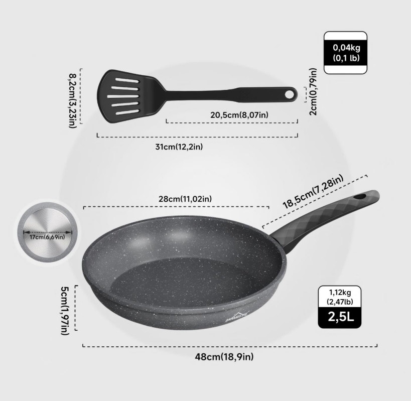 Die Bratpfanne 28 cm eignet sich perfekt zum Braten, Anbraten oder Dünsten von Fleisch, Gemüse und mehr – ein echtes Multitalent für jede Küche. Der mitgelieferte Pfannenwender aus hitzebeständigem PA66 (bis 230 °C) schützt die Antihaftbeschichtung und sorgt für müheloses Wenden und Servieren.Pfanne und Wender im Set – ein praktisches Duo für jeden Haushalt.