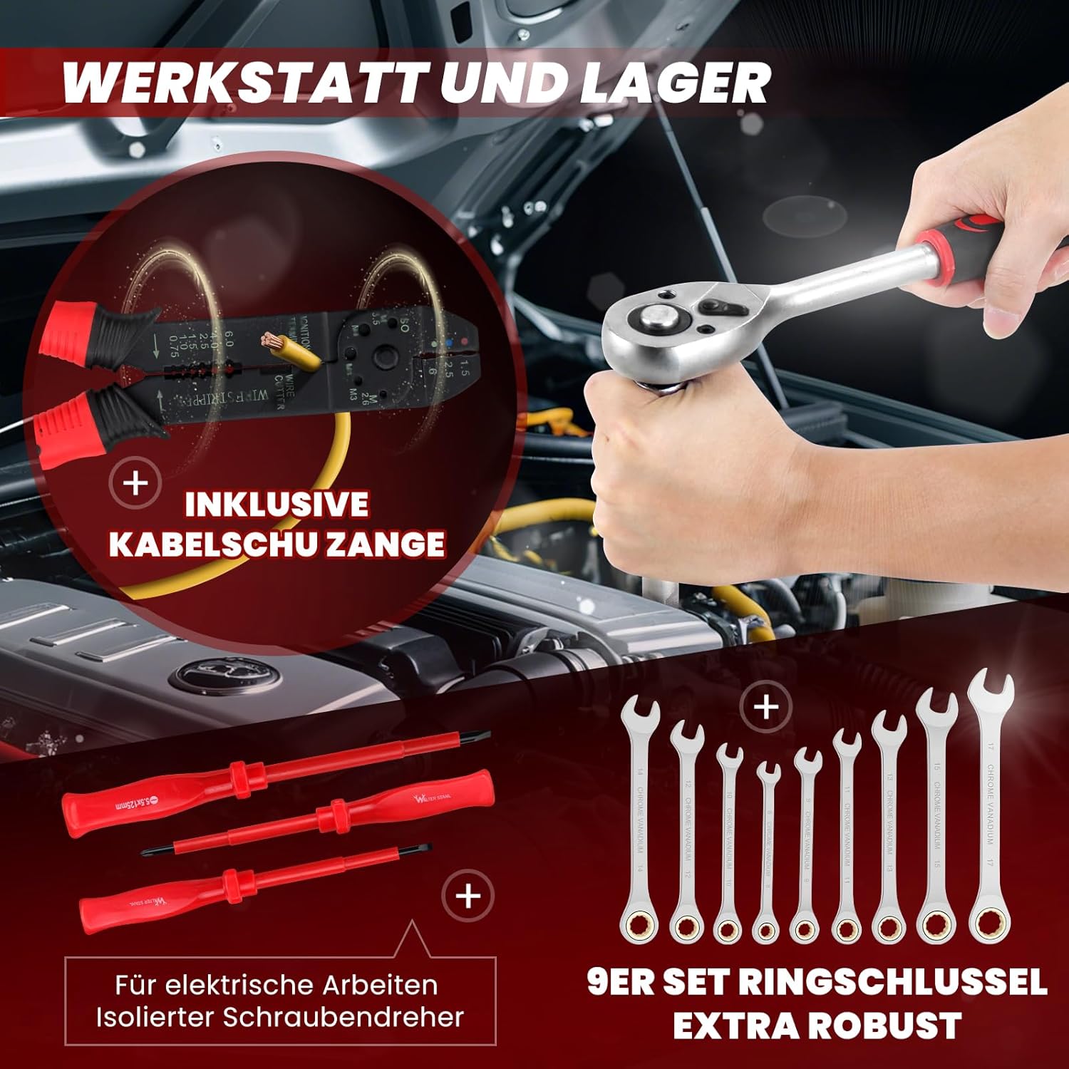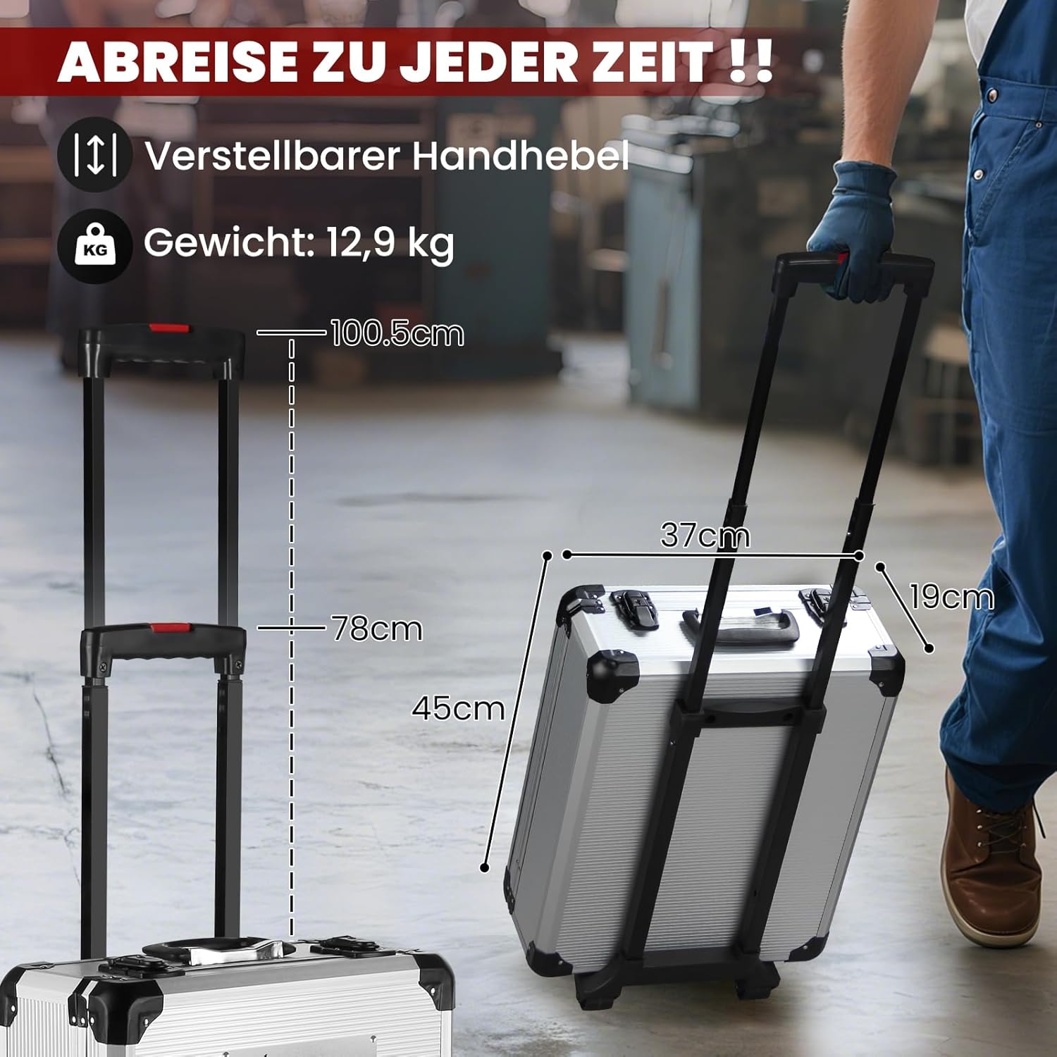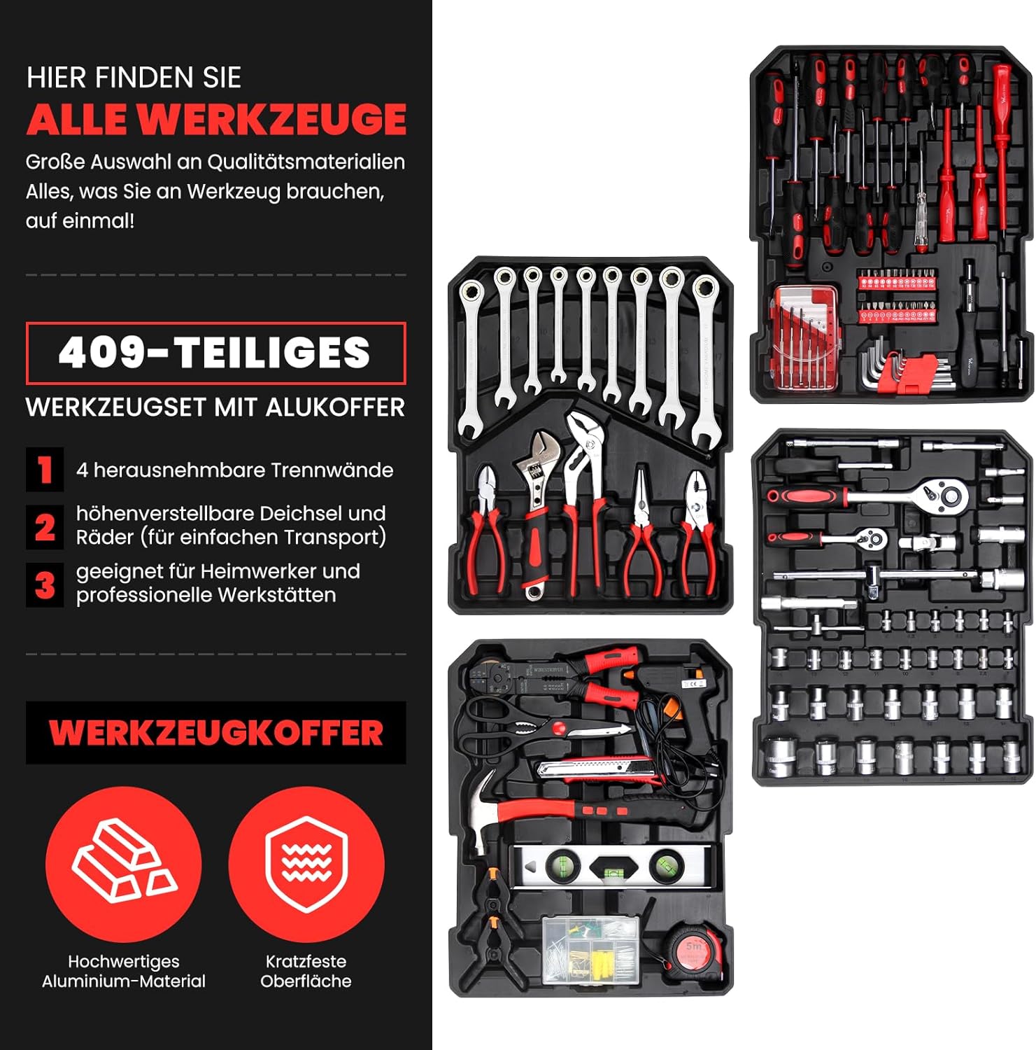 Unser Aluminium Werkzeugtrolley ist mit insgesamt 409 hochwertigen Werkzeugteilen ausgestattet, darunter Ratschen Schraubendreher, Ringschlüssel, und vieles mehr! Ob Du Profi Handwerker oder Heimwerker bist, dieses Set bietet Dir eine breite Palette an Werkzeugen für alle Aufgaben.