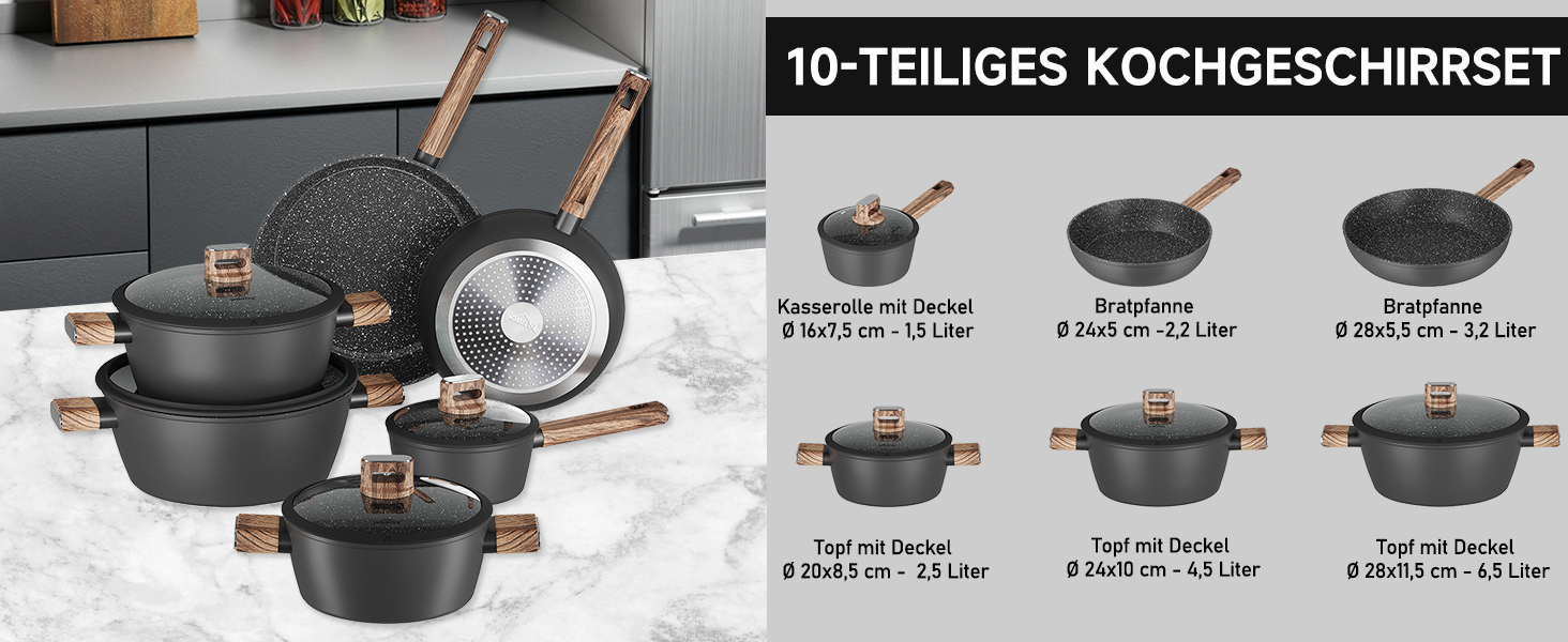 10-teilig, inklusive 1x 16 cm Stielkasserolle mit Deckel - 1,5 L, 1x 20 cm Kochtopf mit Deckel - 2,5 L, 1x 24 cm Kochtopf mit Deckel - 4,5 L, 1x 28 cm Kochtopf mit Deckel - 6,5 L, 1 x 24 cm Bratpfanne - 2,2 L, 1x 28 cm Bratpfanne - 3,2 L