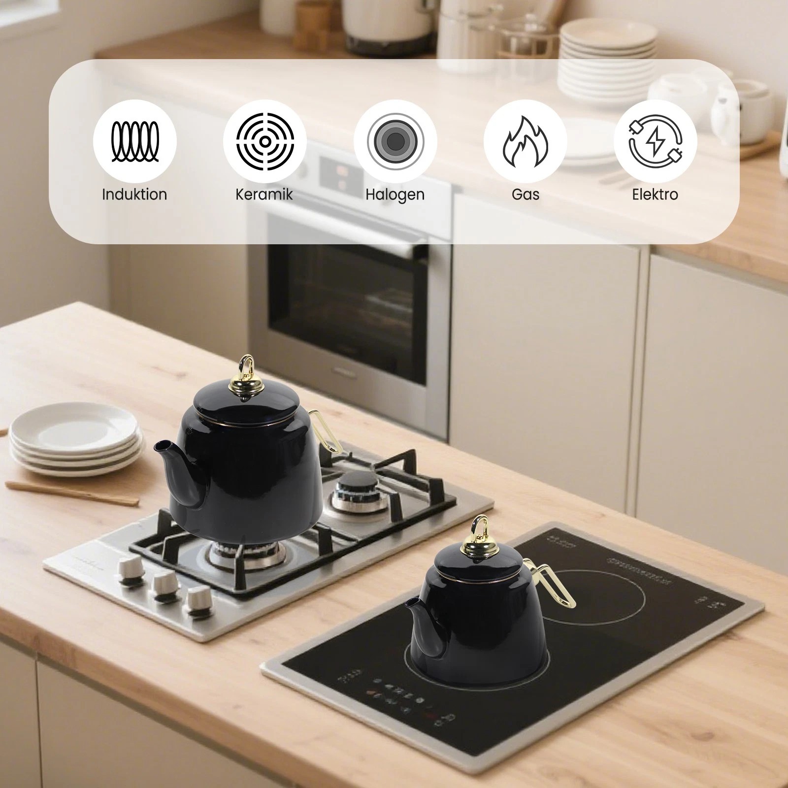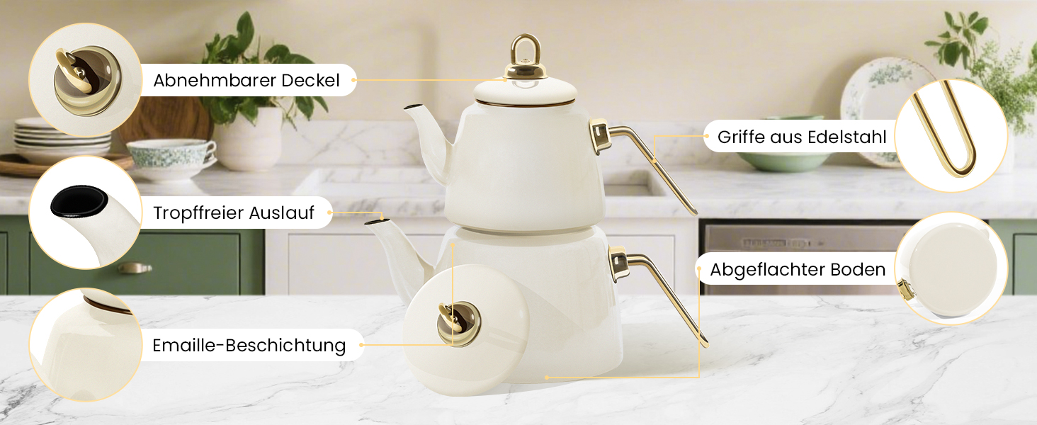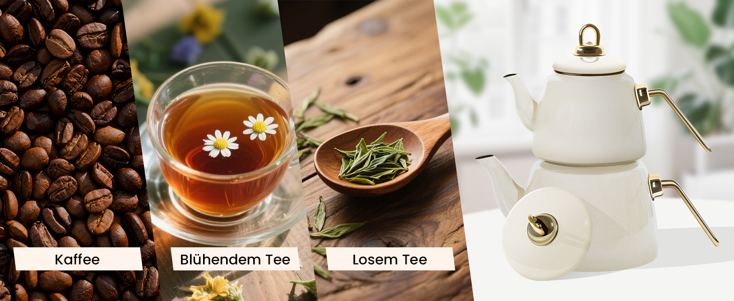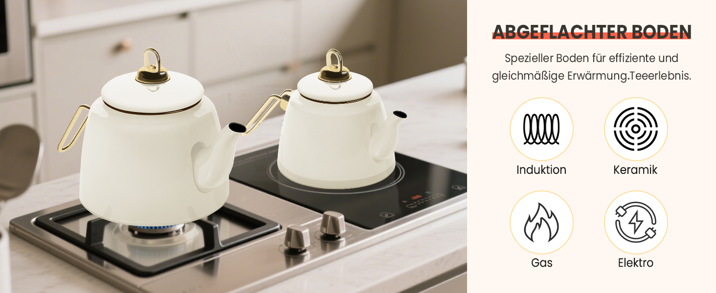 Dieses Teekanne Set Induktion ist kompatibel mit Induktions-, Gas-, Elektro- und Cerankochfeldern. Bitte verwenden Sie den Teekessel bei kleiner oder mittlerer Hitze, da er sehr schnell erhitzt und Energie spart.