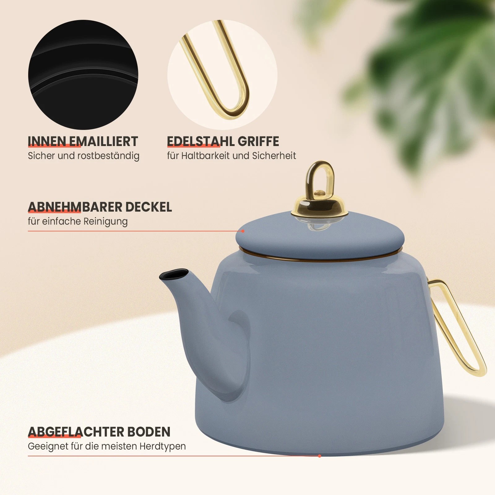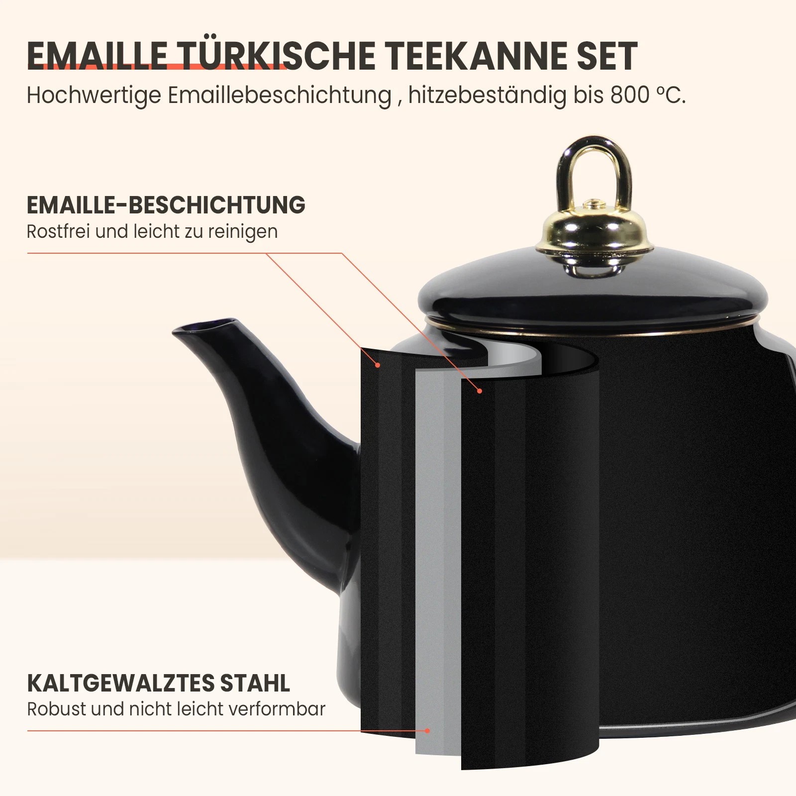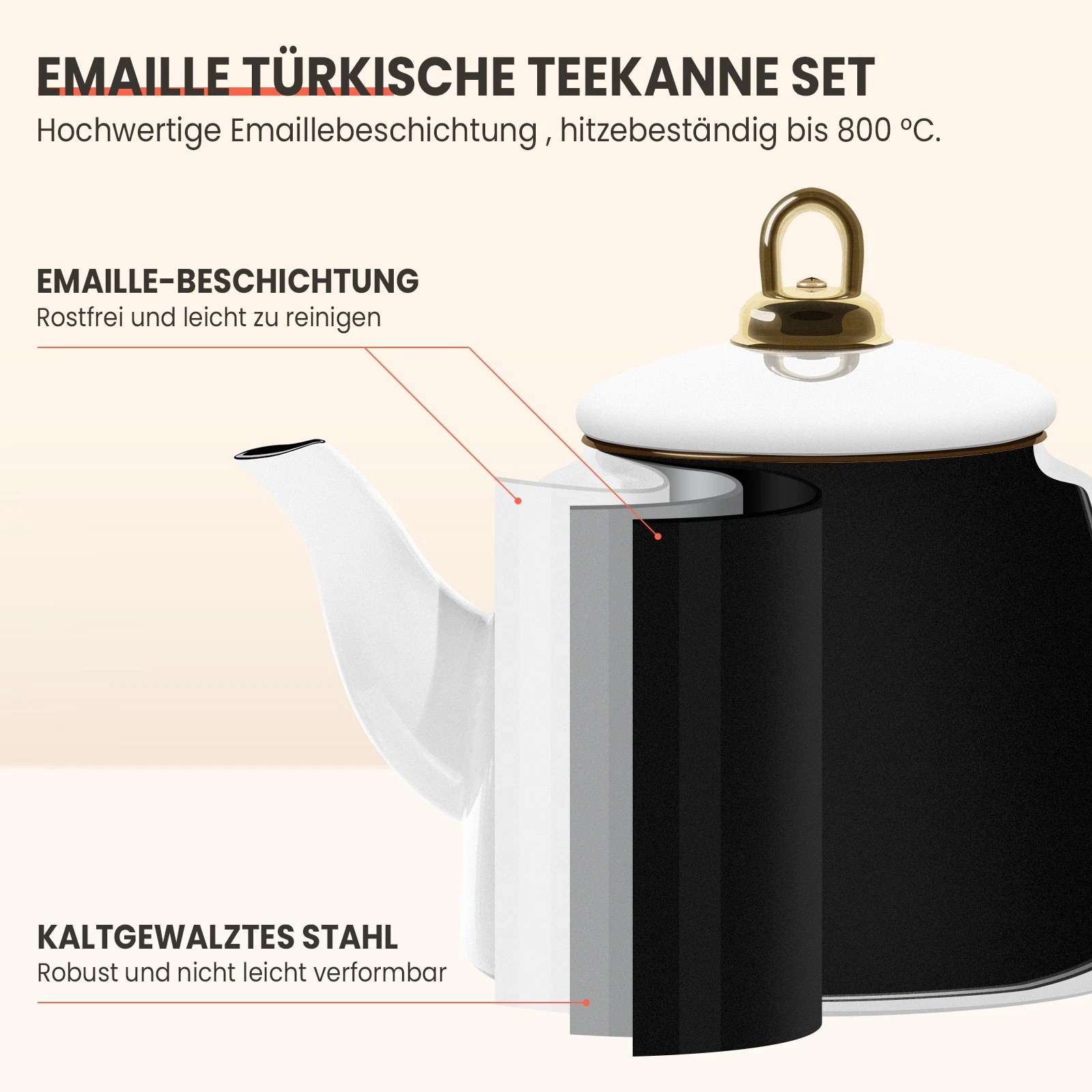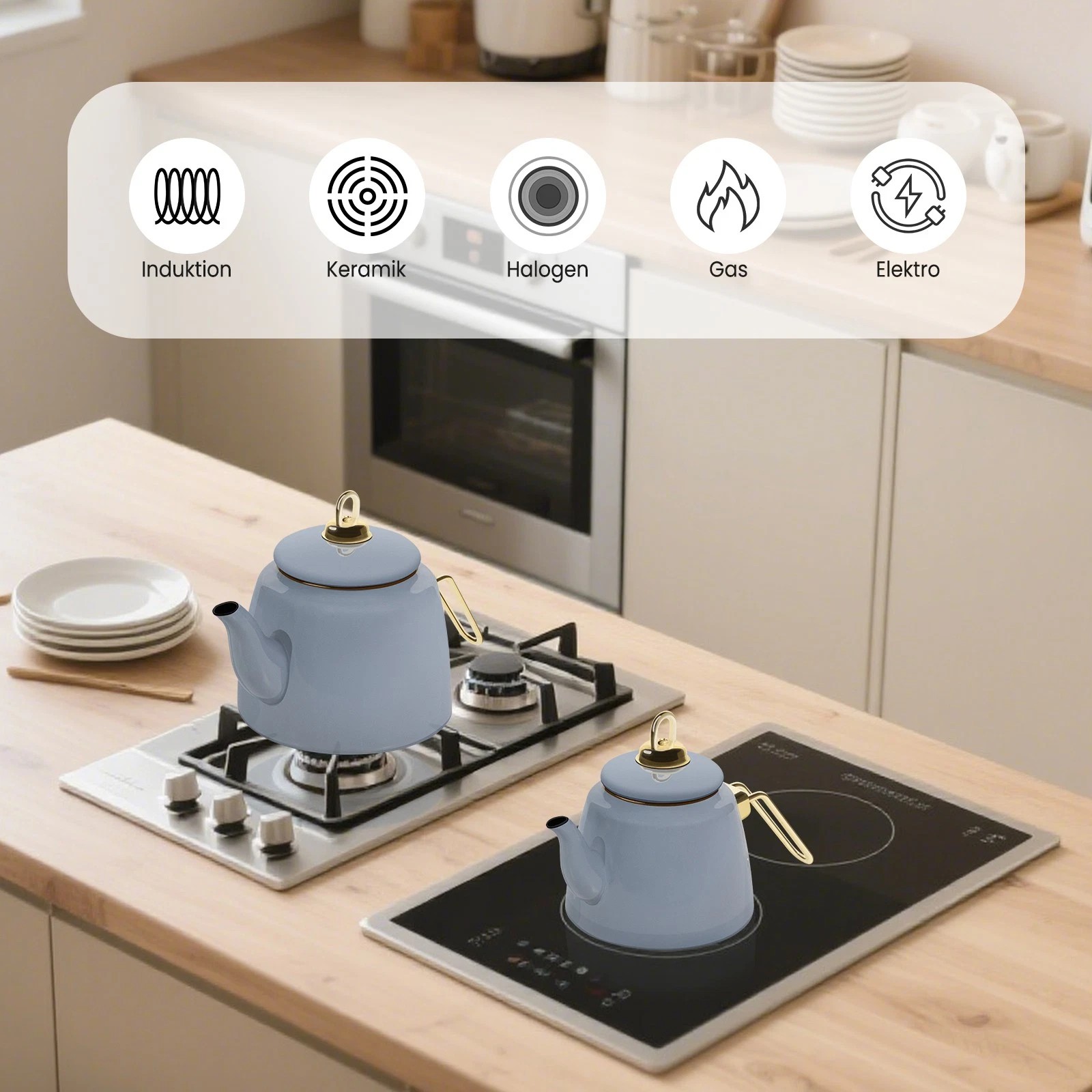 Dieses Teekanne Set Induktion ist kompatibel mit Induktions-, Gas-, Elektro- und Cerankochfeldern. Bitte verwenden Sie den Teekessel bei kleiner oder mittlerer Hitze, da er sehr schnell erhitzt und Energie spart.