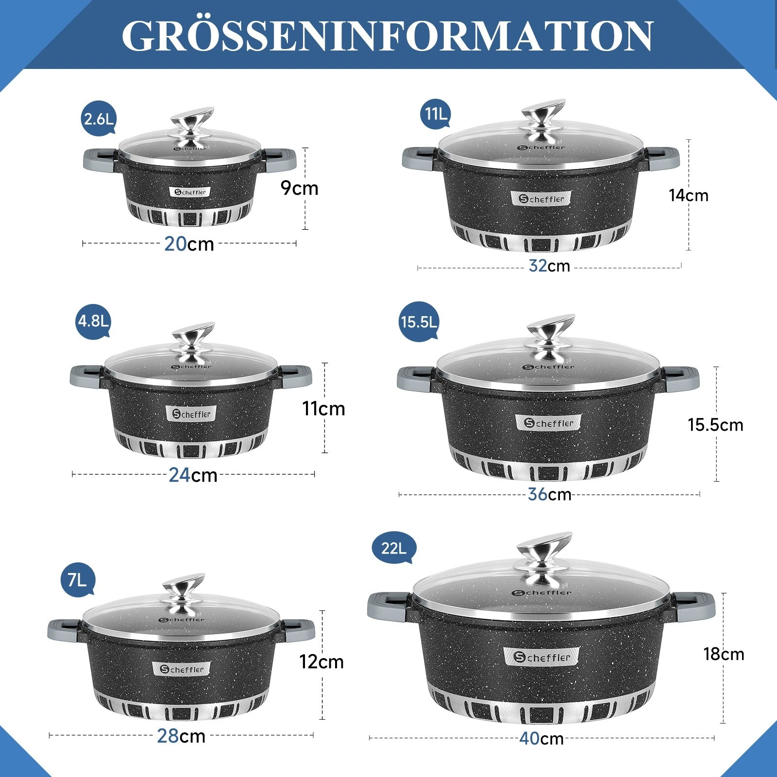 Der Scheffler Aluminium-Kochtopf mit Deckel ist in sechs Größen erhältlich – 20/24/28/32/36/40 cm – und bietet eine hochwertige Kochgeschirrlösung für die mühelose Zubereitung vielfältiger Gerichte. Sein großzügiges Fassungsvermögen erweist sich besonders praktisch beim Kochen großer Mengen.