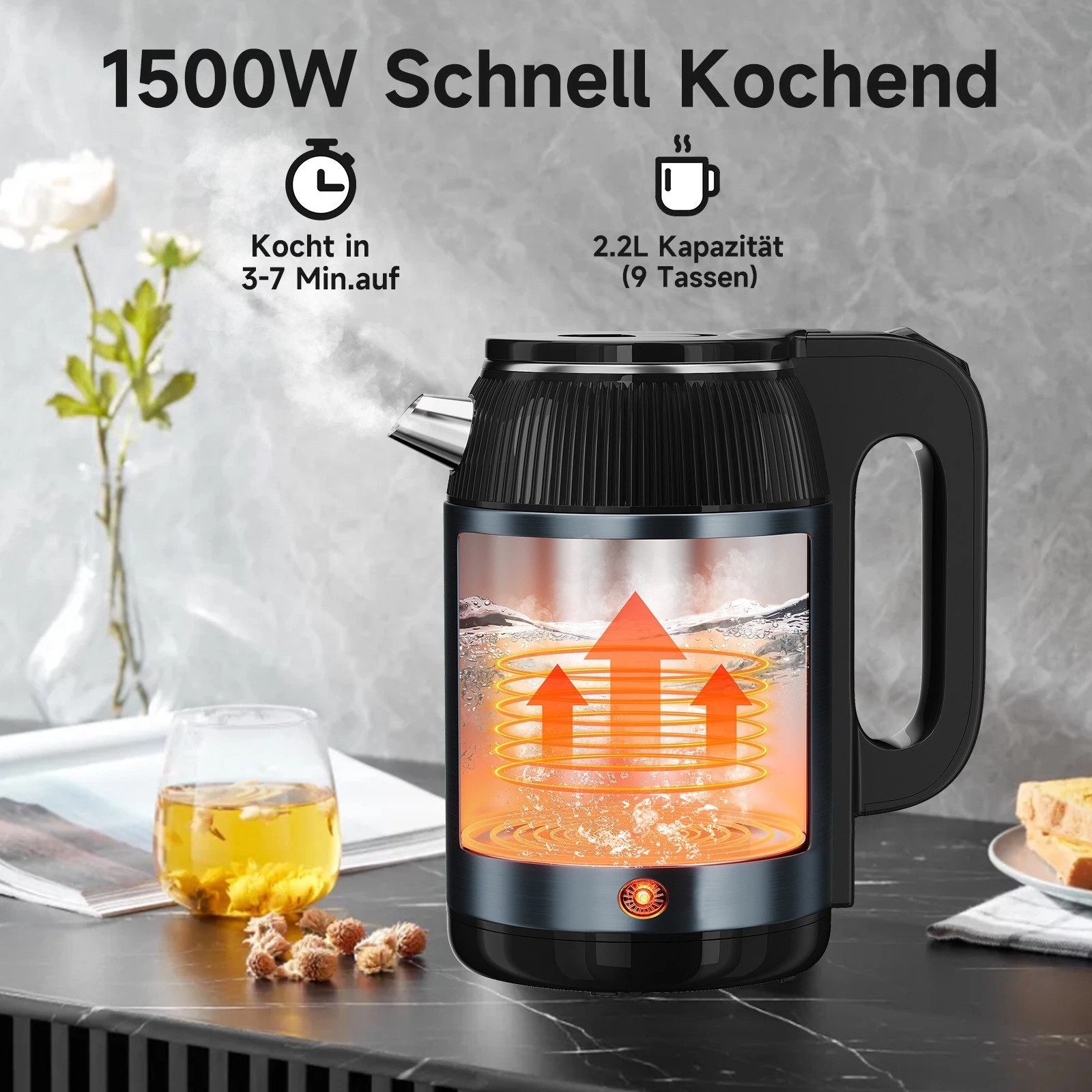 1500 Watt mit 2,2 Liter / 3 Liter Fassungsvermögen. Beide Modelle sorgen für schnelles und effizientes Erhitzen von Wasser.