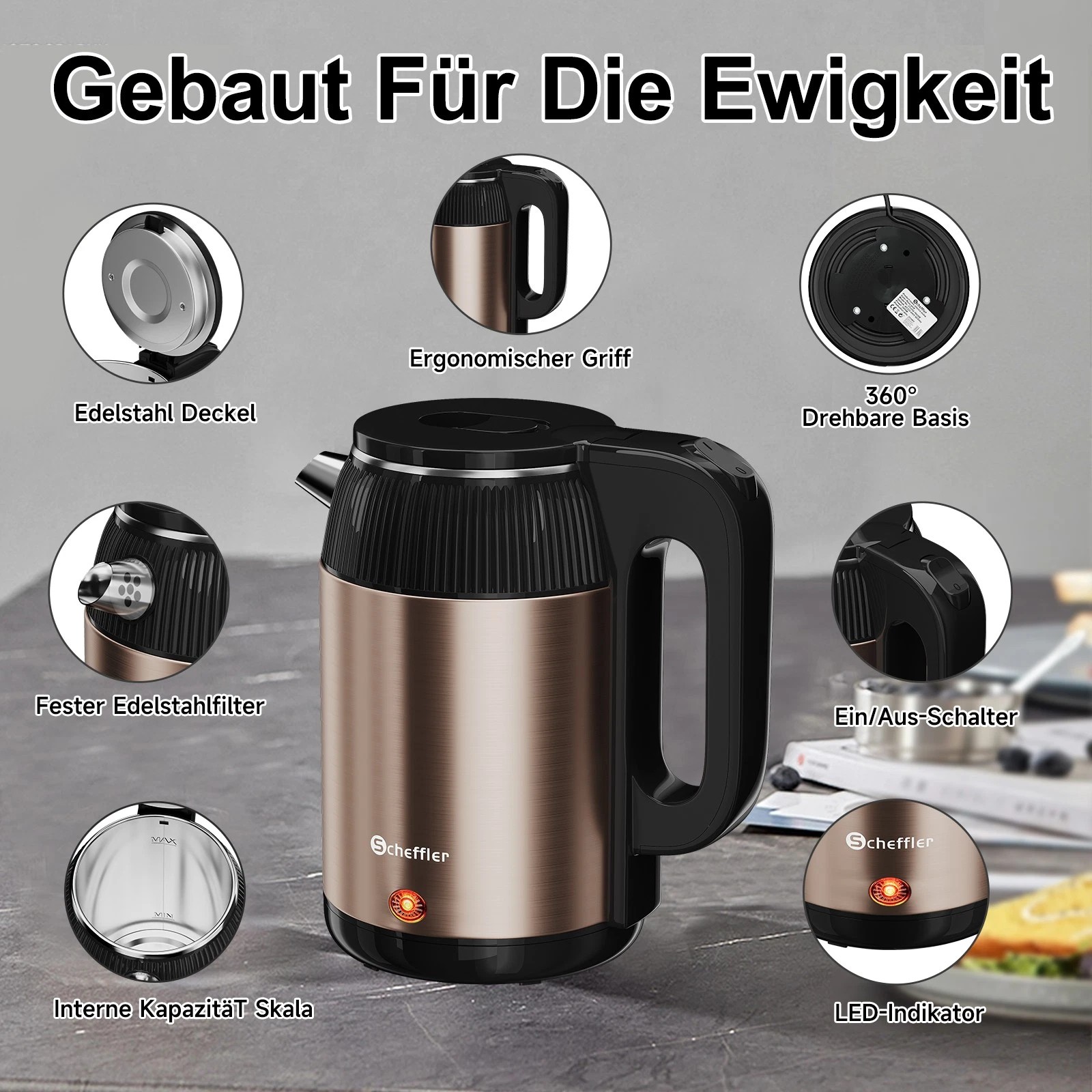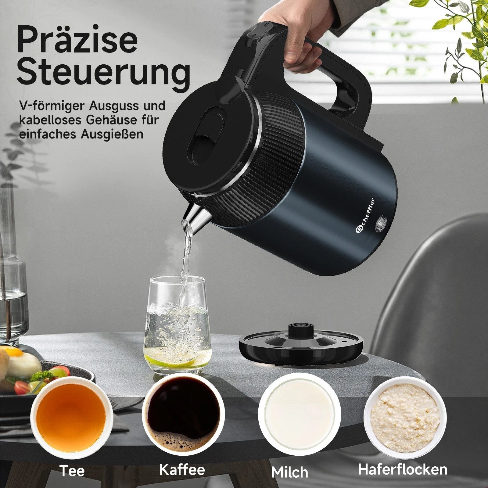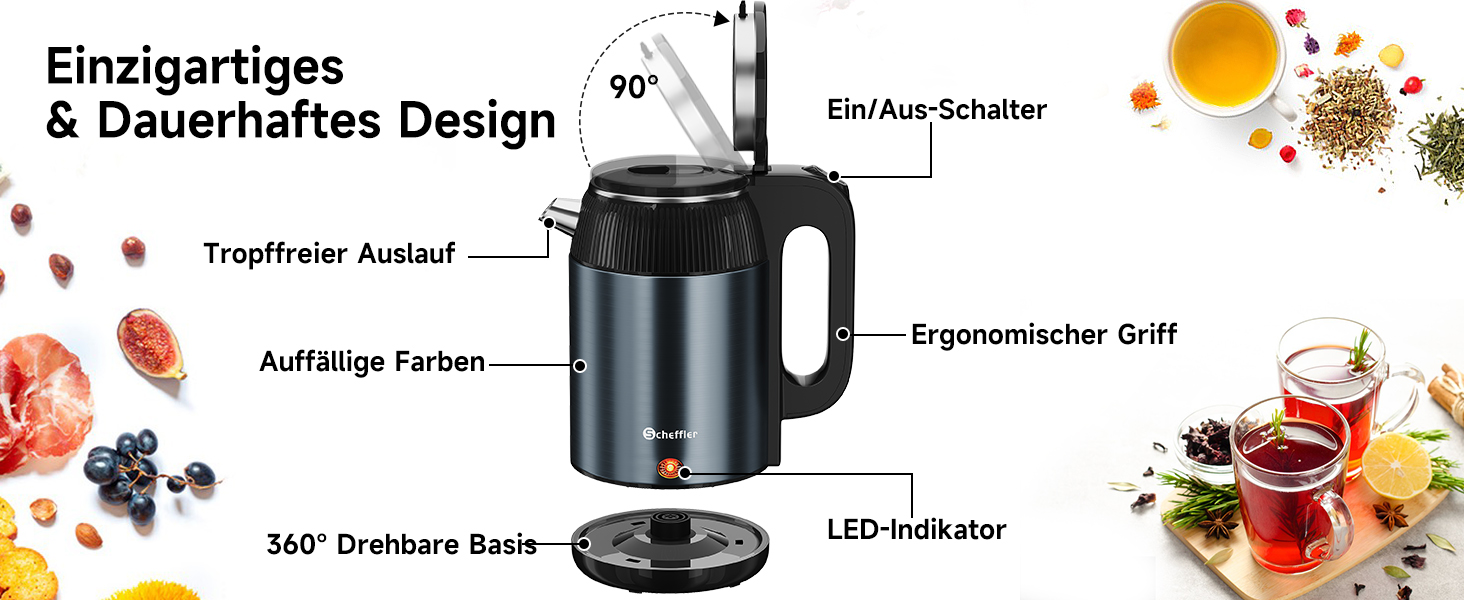 Die 360° Drehbasis ermöglicht eine einfache und flexible Platzierung des Kessels auf dem Heizelement. Dies macht den Wasserkocher besonders benutzerfreundlich und bequem in der täglichen Nutzung.