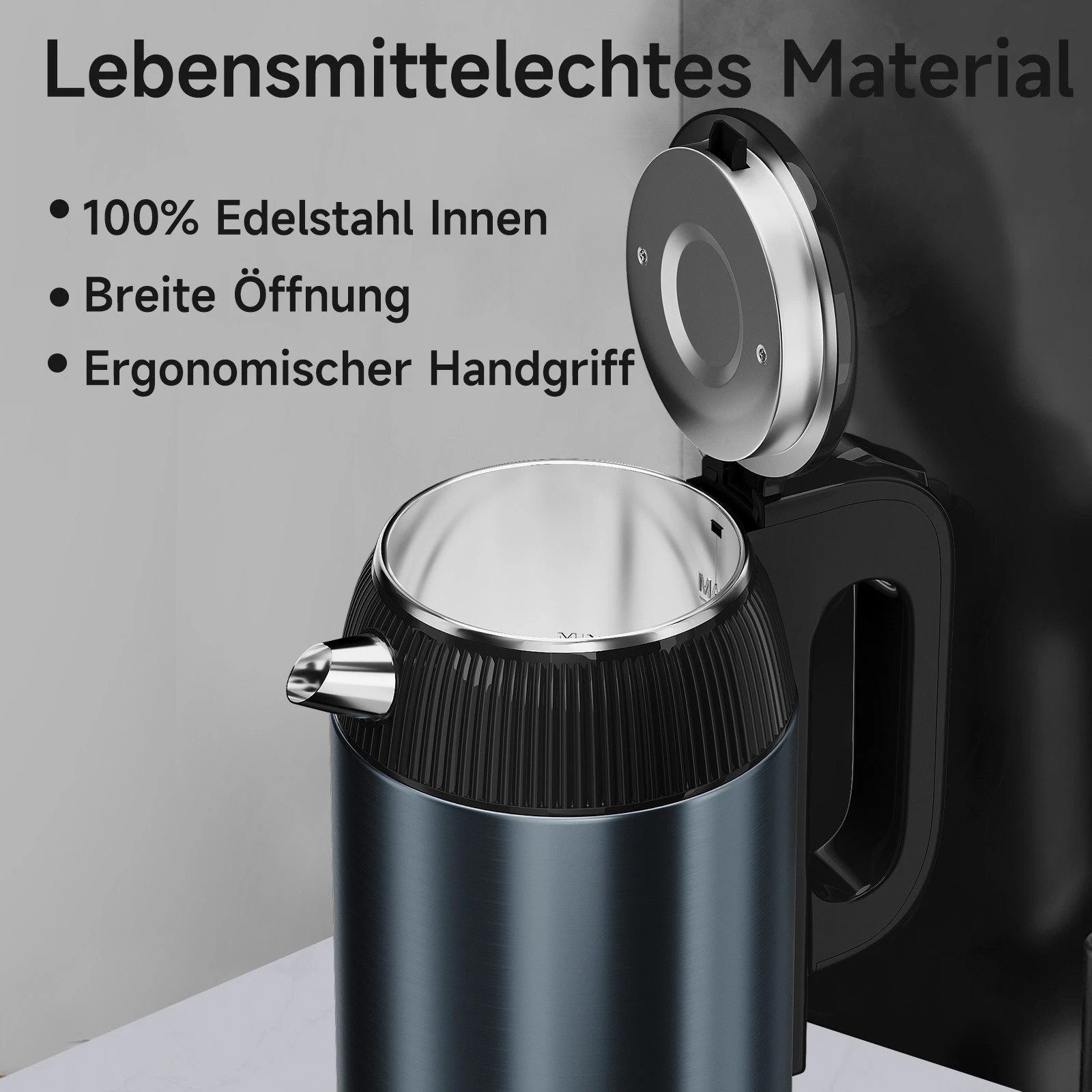 Das Innengehäuse vom Wasserkocher besteht aus lebensmittelechtem Edelstahl - frei von BPA und anderen gesundheitsschädlichen Stoffen. Auch die leise aufkochende Heizspirale liegt innen, das Wasser hat also keinen Kontakt zu Plastik oder gesundheitsschädlichen Stoffen.