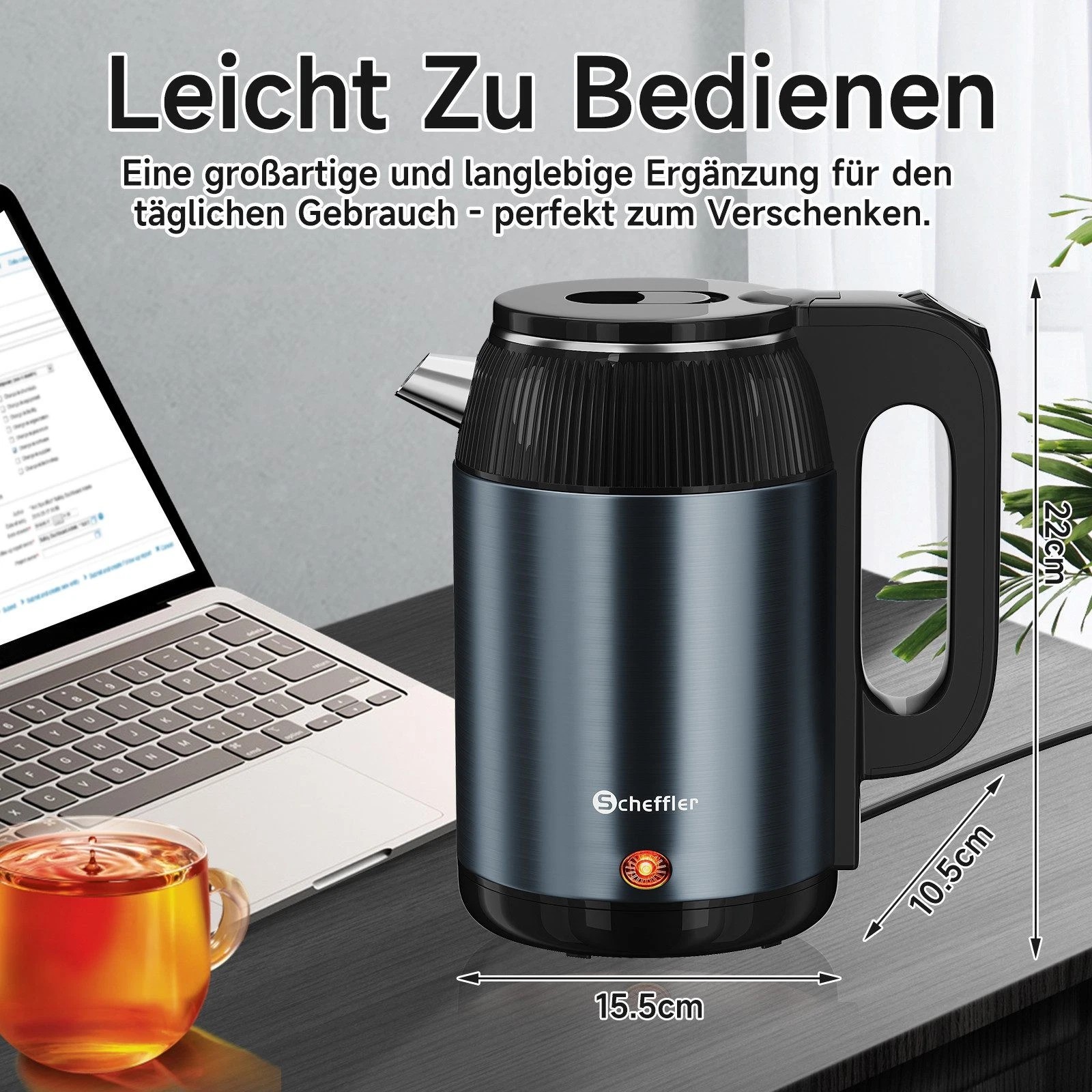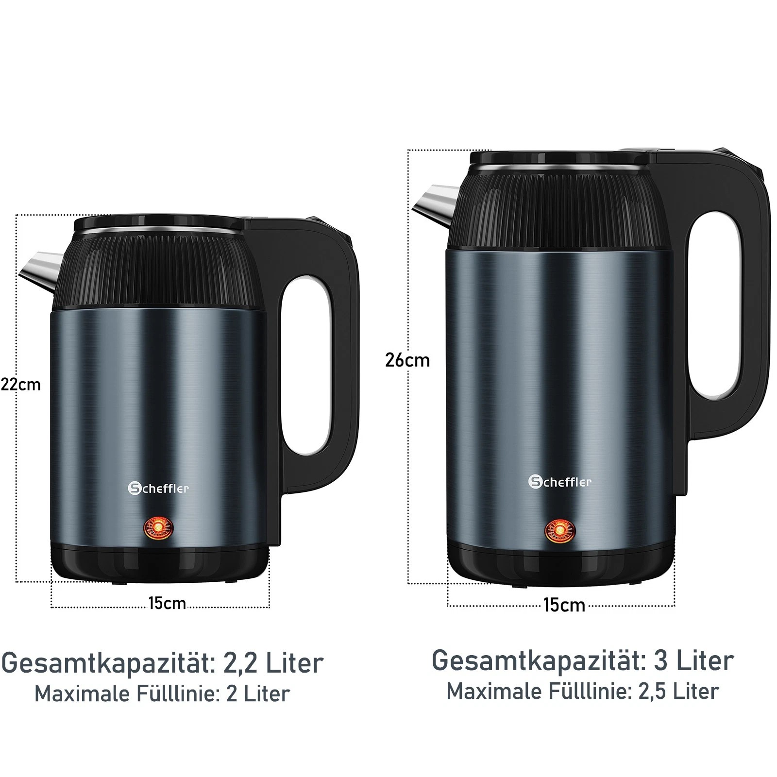Die Wasserkocher sind in zwei leistungsstarken Varianten erhältlich: 1500 Watt mit 2,2 Liter / 3 Liter Fassungsvermögen. Beide Modelle sorgen für schnelles und effizientes Erhitzen von Wasser.