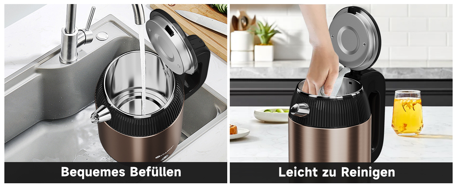 Der breite Auslauf und die interne Wasserstandsanzeige sorgen für präzises Befüllen. LED-Leuchten zeigen jederzeit deutlich den Betriebsstatus des Wasserkochers an. Außerdem verfügen sie über benutzerfreundliche Griffe und einen Präzisionsauslauf für mühelose Bedienung, der ein Verschütten beim Ausgießen verhindert und den Gesamtkomfort erhöht.