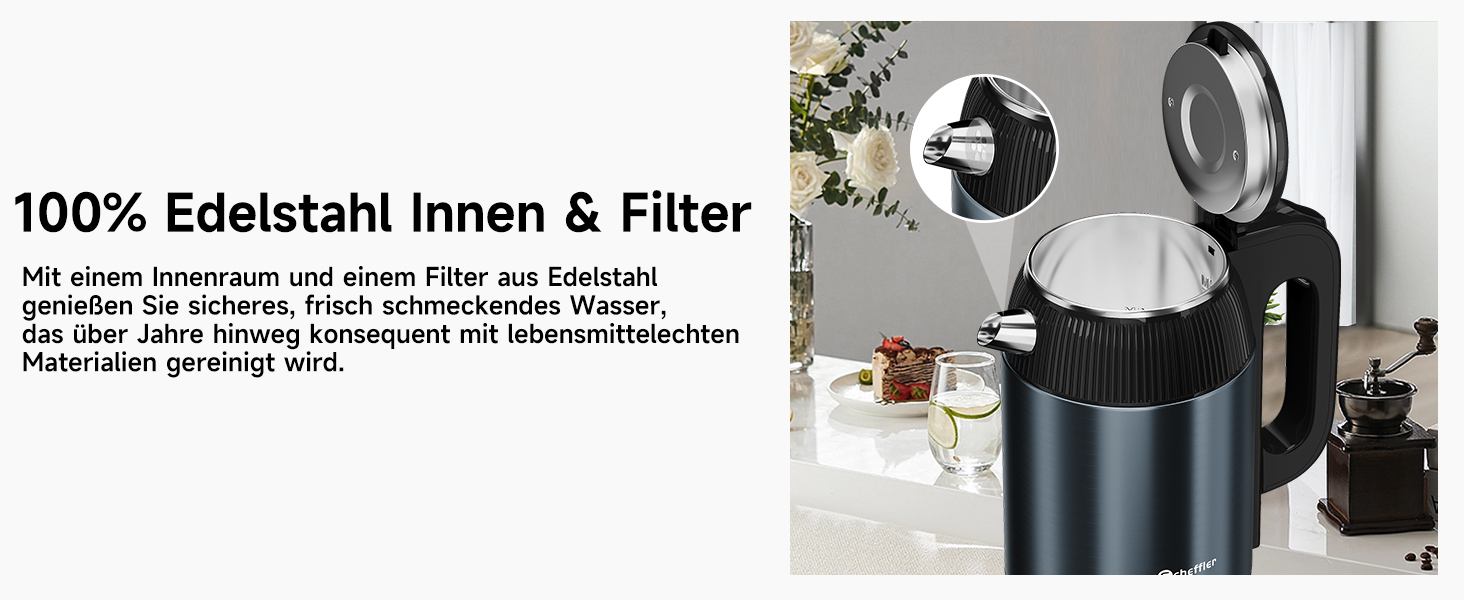 Die Wasserkocher verfügen über automatische Abschaltfunktionen, um ein Überhitzen zu verhindern. Da die Heizelemente des Wasserkochers im Edelstahl Mantel verdeckt sind, ist der Wasserkocher besonders leicht zu reinigen.
