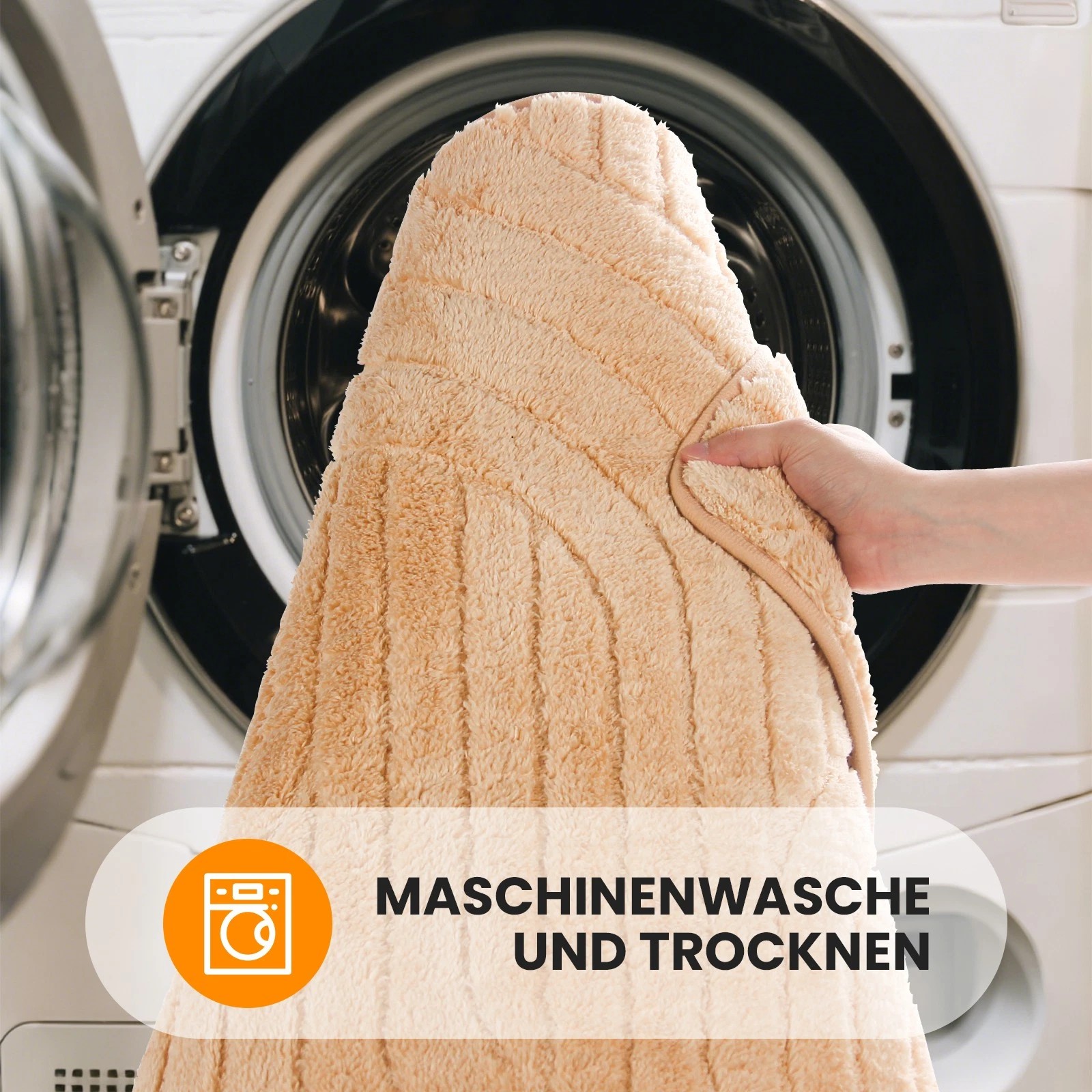 Mit der fortschrittlichen Faserverriegelungstechnologie ist jede Faser fest mit der Rückseite verbunden, so dass das Badteppichset immer wieder gewaschen werden kann, ohne zu vergießen. Einfach in der Waschmaschine in kaltem Wasser waschen, im Wäschetrockner auf niedriger Stufe oder an der Luft trocknen. Nicht bleichen.
