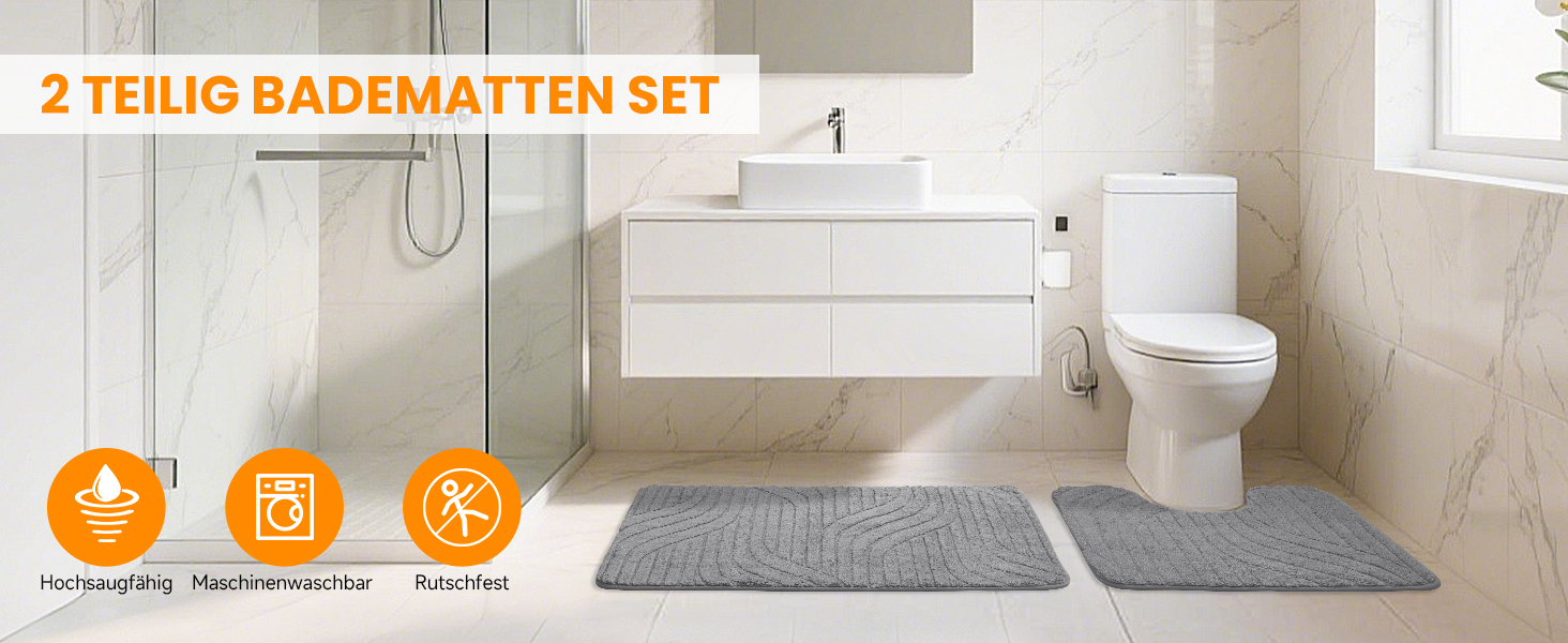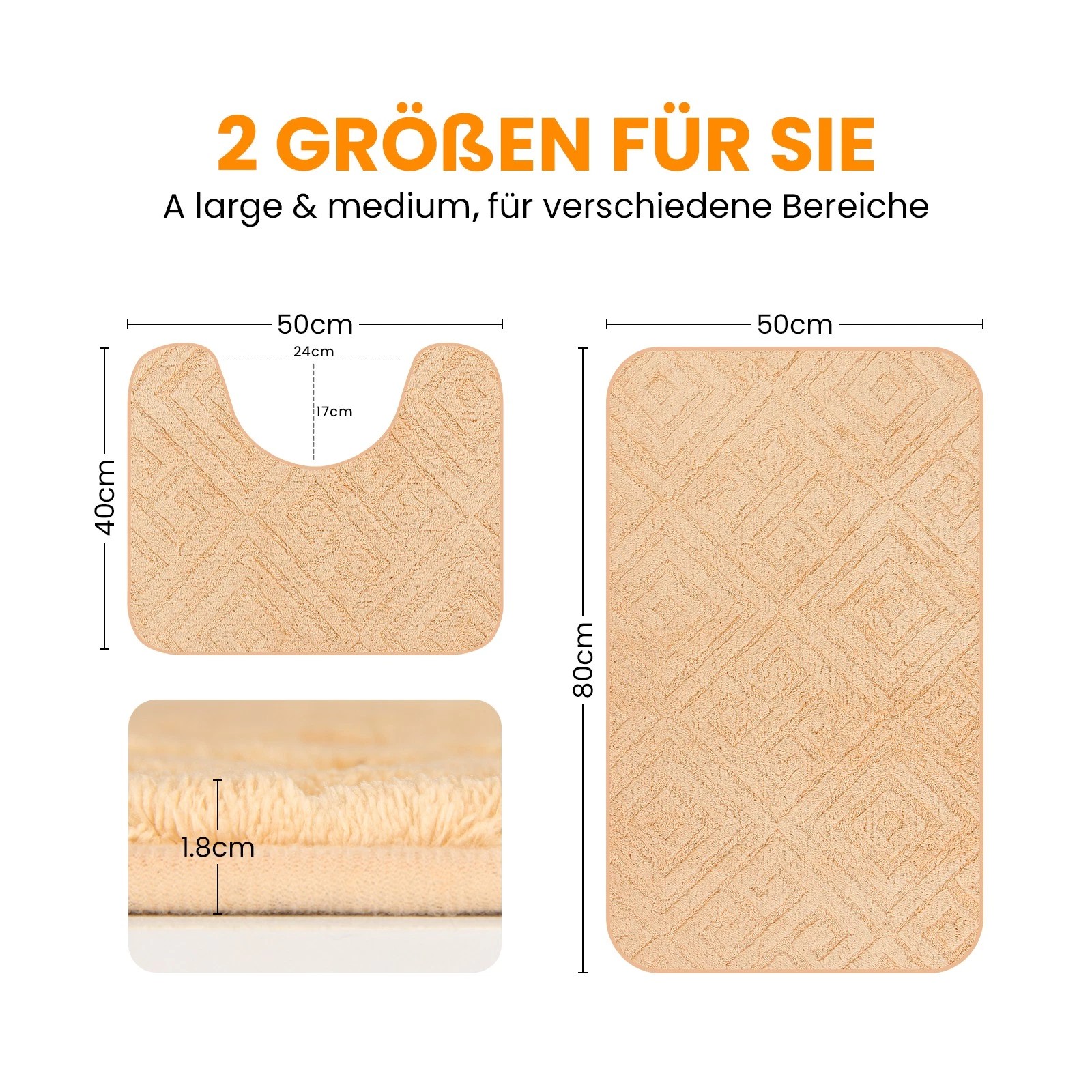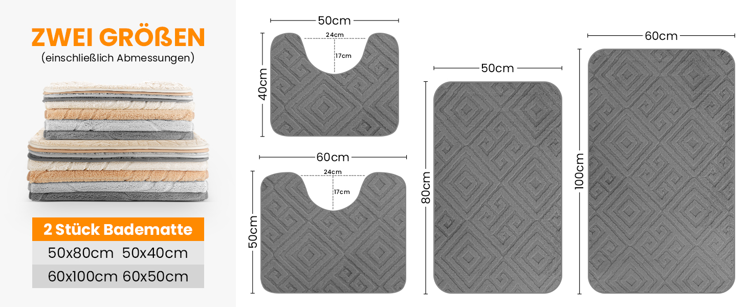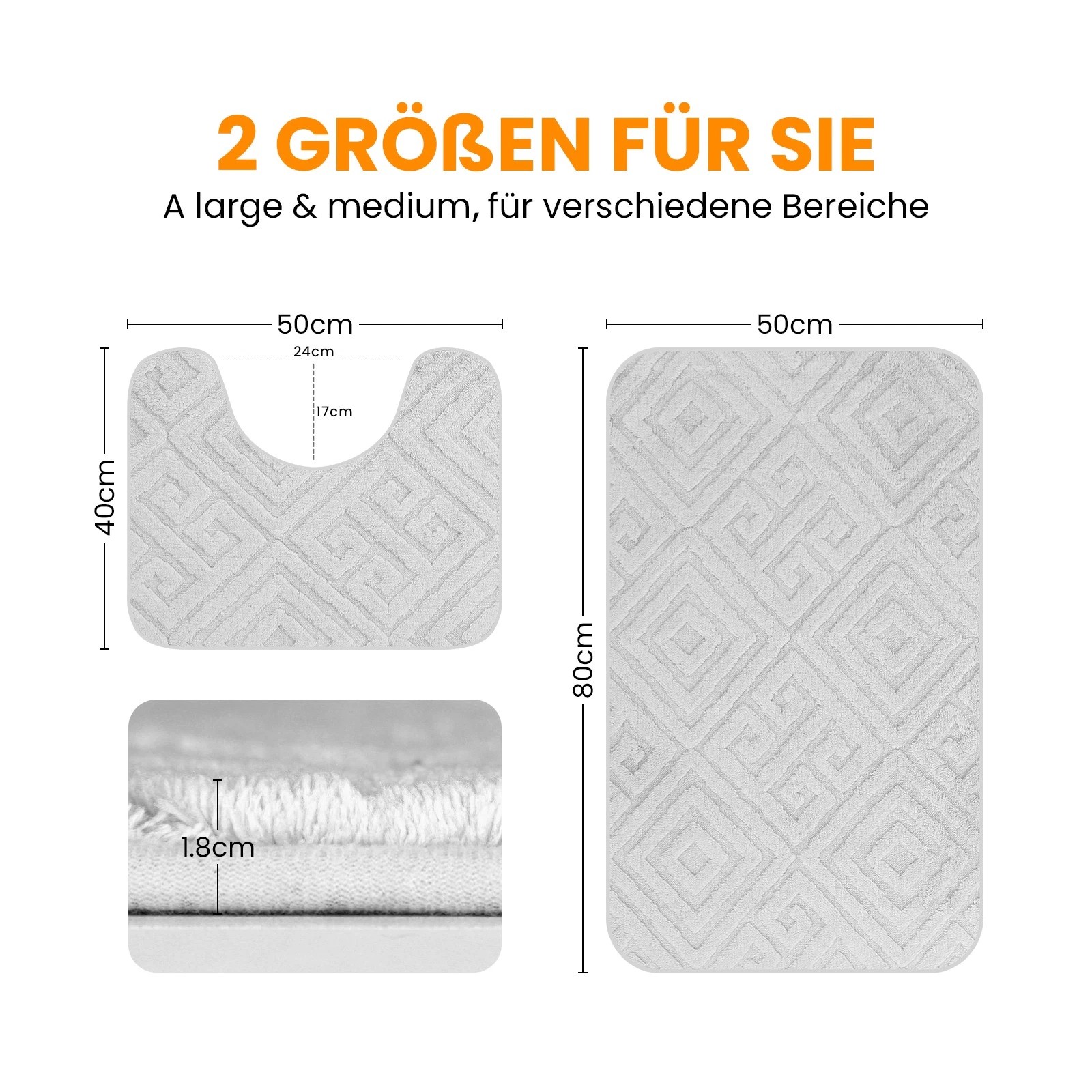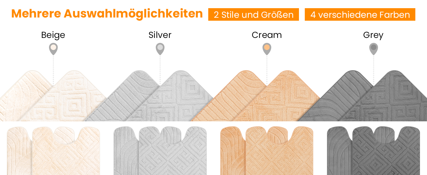 Verfügbar in vier eleganten Farben (Cream, Grau, Silber, Beige) und mit der Wahl zwischen zwei ansprechenden Mustern (Griechischen Stil und Geometrisch Streifen), lässt sich das Set perfekt an Ihren persönlichen Einrichtungsstil anpassen. Darüber hinaus können Sie zwischen zwei Größenvarianten wählen: • Kleine Ausführung (50x80 cm & 50x40 cm): ideal für kompakte Bäder • Große Ausführung (60x100 cm & 60x50 cm): mehr Fläche, maximaler Komfort nach dem Duschen