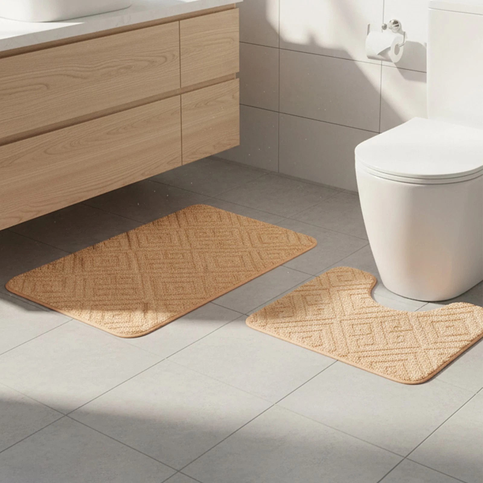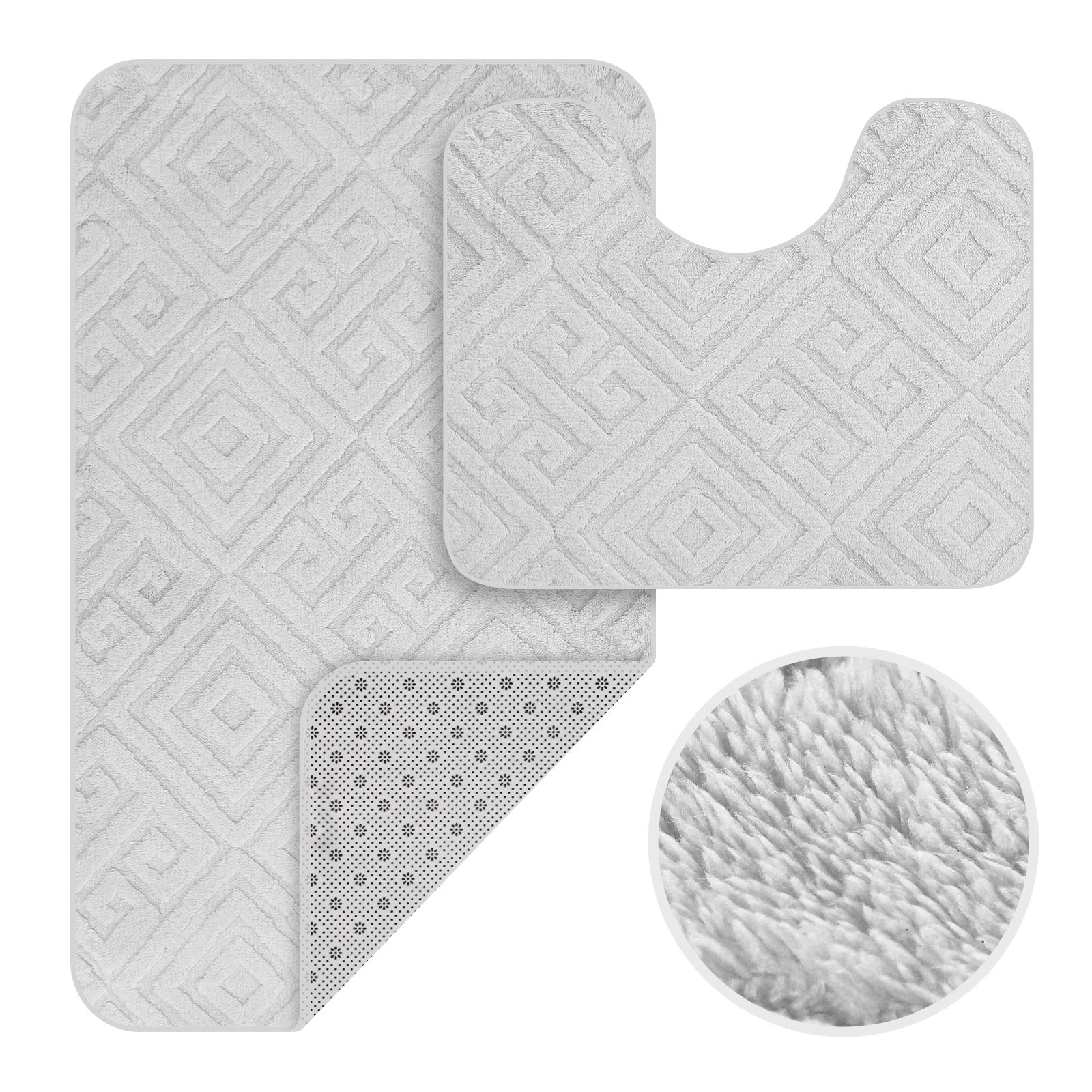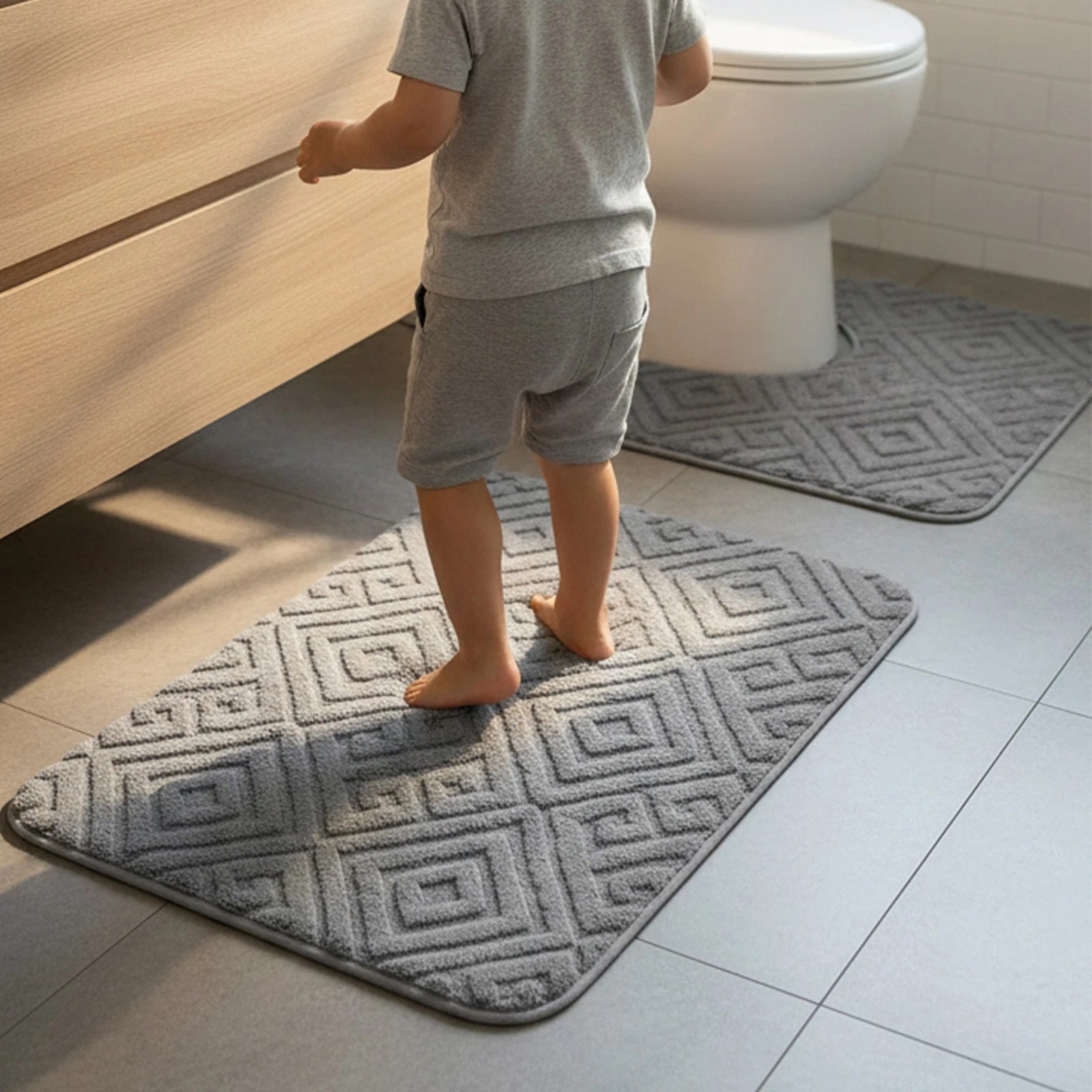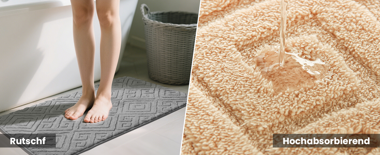 Verfügbar in vier eleganten Farben (Cream, Grau, Silber, Beige) und mit der Wahl zwischen zwei ansprechenden Mustern (Griechischen Stil und Geometrisch Streifen), lässt sich das Set perfekt an Ihren persönlichen Einrichtungsstil anpassen. Darüber hinaus können Sie zwischen zwei Größenvarianten wählen: • Kleine Ausführung (50x80 cm & 50x40 cm): ideal für kompakte Bäder • Große Ausführung (60x100 cm & 60x50 cm): mehr Fläche, maximaler Komfort nach dem Duschen