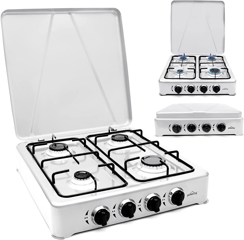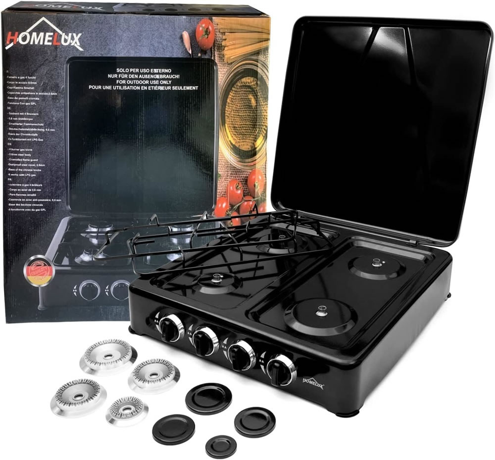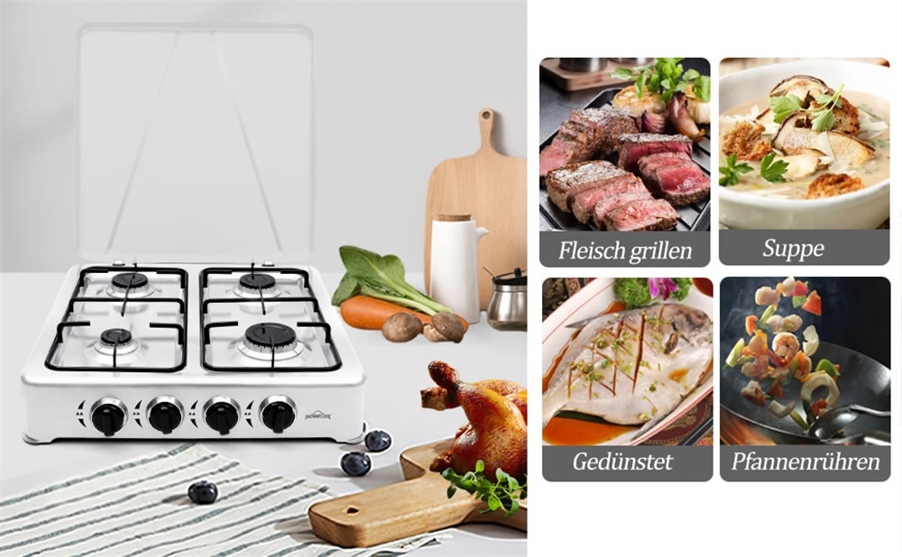 Das Metallgitter des Gaskochfelds besteht aus Aluminiumguss und kann zur Reinigung abgenommen werden.Die Größe des Gasherds beträgt 51,2 x57 cm , was Ihre Anforderungen für die gleichzeitige Zubereitung aller Arten von Lebensmitteln erfüllen kann. Auch die Pfanne mit Griff lässt sich leicht abstellen. Tipps: Dieser Gaskocher ist nur für den Außenbereich geeignet, verwenden Sie ihn nicht im Innenbereich.