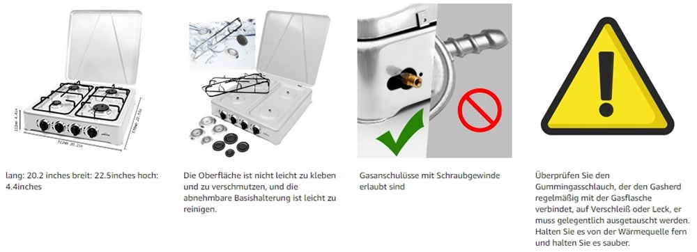 Die Gesamtleistung von 4 Brennern beträgt 6,2 KW: Schnellbrenner 2,2 KW, zwei halb schnelle Brenner 1,5 KW, Hilfsbrenner 1 KW. Tipps: Dieses Produkt enthält keine Gasleitungen und Schrauben, Sie müssen es selbst kaufen. Bitte sehen Sie sich unser Video für die Installationsschritte an, danke.