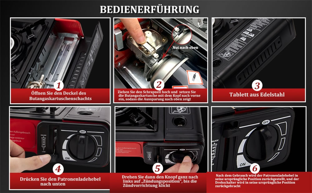 Unser tragbarer Gasgrill ist einfach zu installieren und zu bedienen, jeder kann schnell loslegen, legen Sie einfach den Butangasbrennstoff auf den richtigen Kartensteckplatz und decken Sie ihn ab. Der tragbare Butangaskocher kann entfernt werden. Dadurch lassen sich Komponenten einfach entnehmen und reinigen. Entfernen Sie einfach die Platte von der Oberseite des Brenners und dann können Sie ihn reinigen!