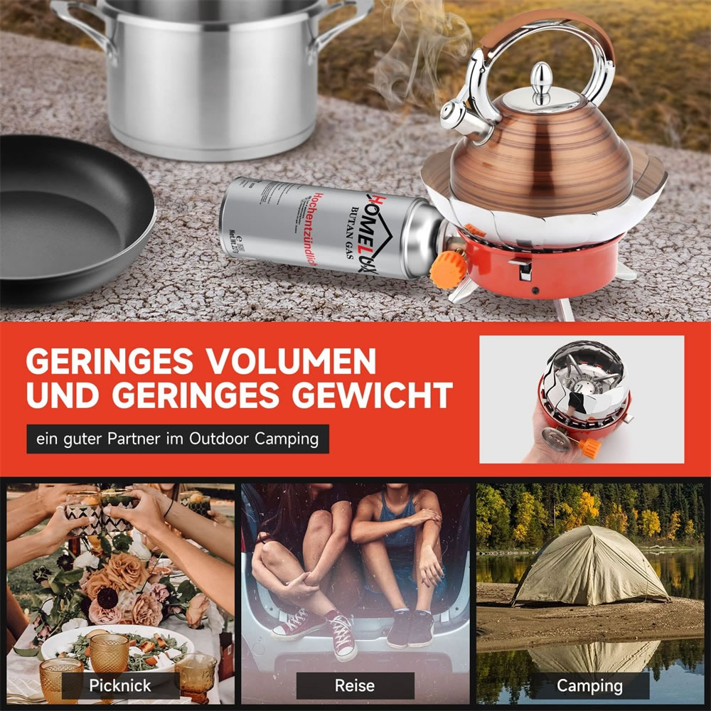 Der Mini Gaskocher von Homelux ist kompakt und leicht und wiegt nur 420g. Durch das faltbare Design nimmt es kaum Platz ein. Es sind keine Verbindungsrohre oder Adapter aus erforderlich, es kann zur Verwendung direkt an den flachen Gastank angeschlossen werden, und die Bedienung ist einfach und schnell.