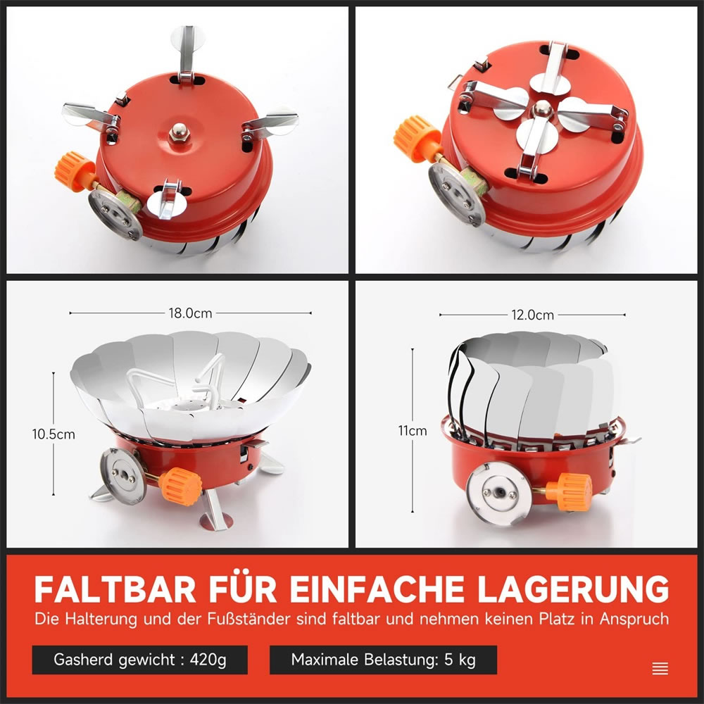 Der Gasherd hat ein Windschutzscheibendesign. Wenn es im Freien verwendet wird, kann es den Wind gut blockieren, Wärme sammeln und Speisen schnell kochen. Die rutschfesten Metallfüße an der Unterseite können das Wackeln des Gasherds wirksam verhindern und für Stabilität sorgen. Humanisiertes Design ermöglicht Ihnen eine bessere Erfahrung.