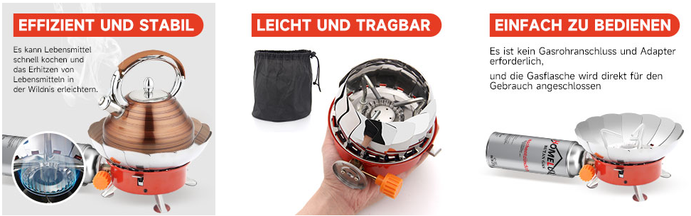 Dieser Campingkocher verfügt über ein Spannungszündsystem, sodass kein zusätzliches Feuerzeug mitgeführt werden muss, was sicherer ist. Das Ventil kann die Größe des Feuers anpassen, sogar heizen, und eine effiziente Verbrennungseffizienz spart Ihre Kochzeit.