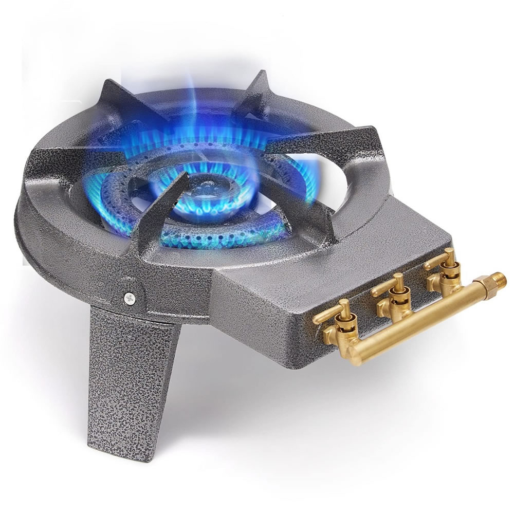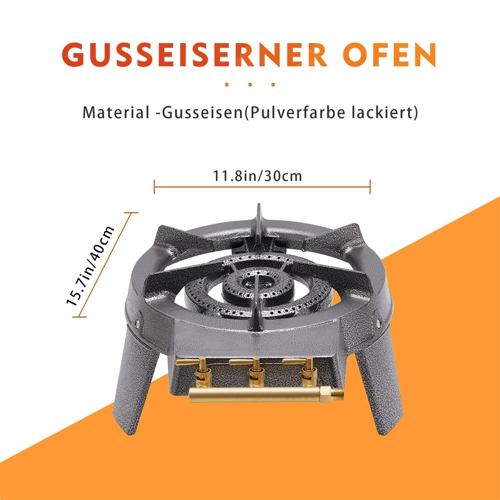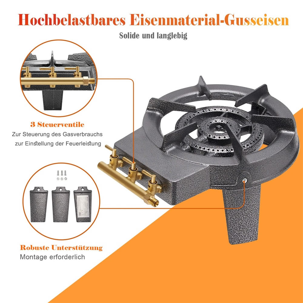 Dieser Gaskocher Gasbrenner ist aus Gusseisen für eine lange Lebensdauer. Gaskocher Normalleistung: 9,0 kW, Gasverbrauch: 655g/h. Hochleistungs-Brennerkopf aus Gusseisen mit 3 regelbare Brennerkreise für einstellbares Feuer, um den Gasverbrauch zu steuern, um die Feuerkraft einzustellen.