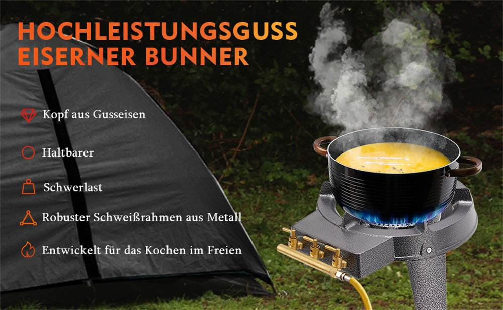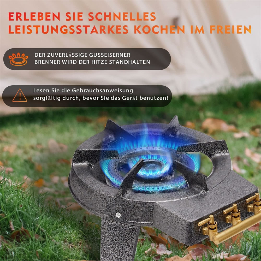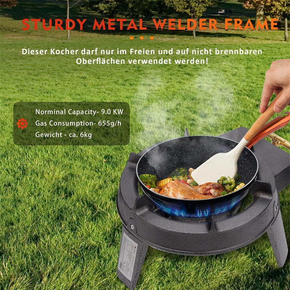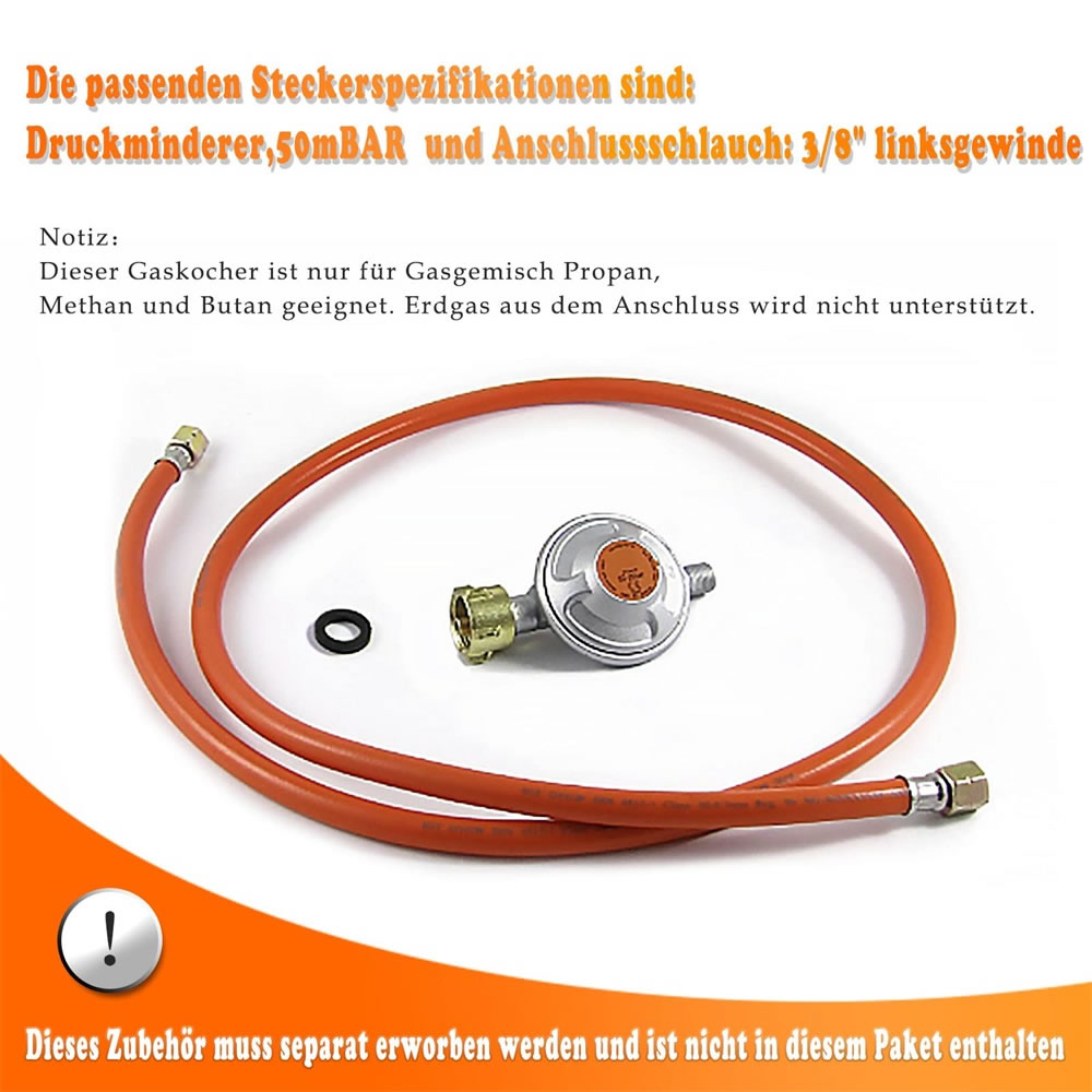 Propangaskocher mit Robuster Schweißerrahmen aus Metall, perfekt für die meisten Kochbehälter (20–35 cm). Die empfohlene Garbehälter Größe beträgt 20-35 cm:Crêpe-Pfanne ,Wasserkocher,Suppentopf,Flacher Wok,Bratpfanne,Steakteller.{Tipps: Anschlüsse für dieses Produkt:Druckminderer, 50mBAR Anschluss: 3/8" linksgewinde Dieses Gaskocher Camping enthält keine Gasleitungen und Schrauben , müssen Sie es selbst kaufen.}