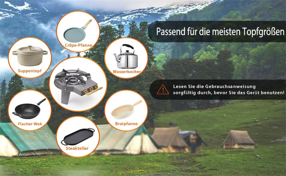Bitte verwenden Sie das Streichholz, um das Feuer anzuzünden, wenn Sie den Controller einschalten.Die Flamme kann durch Drehen des Knopfes am Zünder während des Kochens eingestellt werden. Gas Kocher mit Brenner verteilen die Wärme gleichmäßig in der Mitte und an den Rändern des Topfes, um ein perfektes Garen zu gewährleisten. (Die Art der Behälter ist 13 kg Butan-/Propangas und sollte in einem Belüftungsraum stehen.)