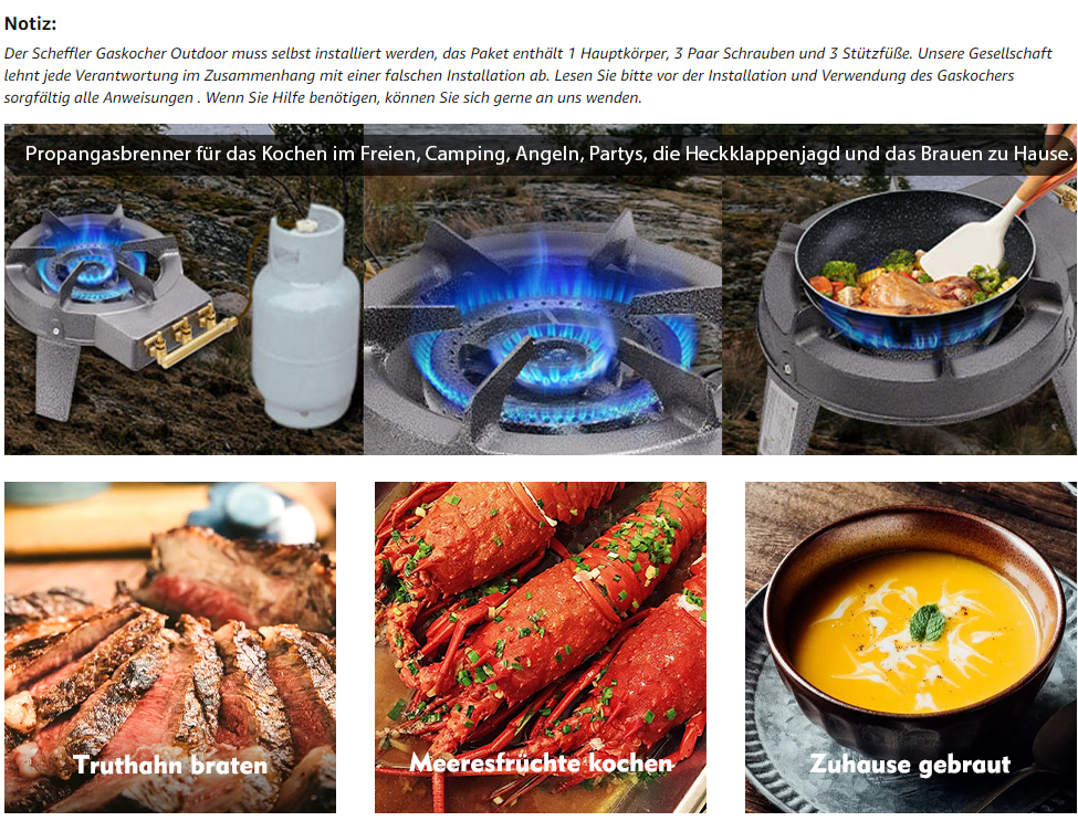 Der Scheffler Gaskocher Outdoor/Hockerkocher muss selbst installiert werden, das Paket enthält 1 Hauptkörper, 3 Paar Schrauben und 3 Stützfüße. Dieser Gaskocher ist nur für Gasgemisch Propan, Methan und Butan geeignet. Erdgas aus dem Anschluss wird nicht unterstützt.Unsere Gesellschaft lehnt jede Verantwortung im Zusammenhang mit einer falschen Installation ab. Lesen Sie bitte vor der Installation und Verwendung des Gaskochers sorgfältig alle Anweisungen.