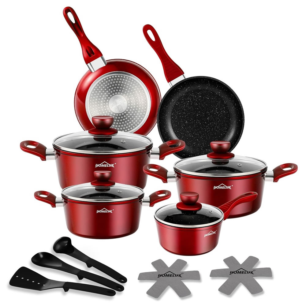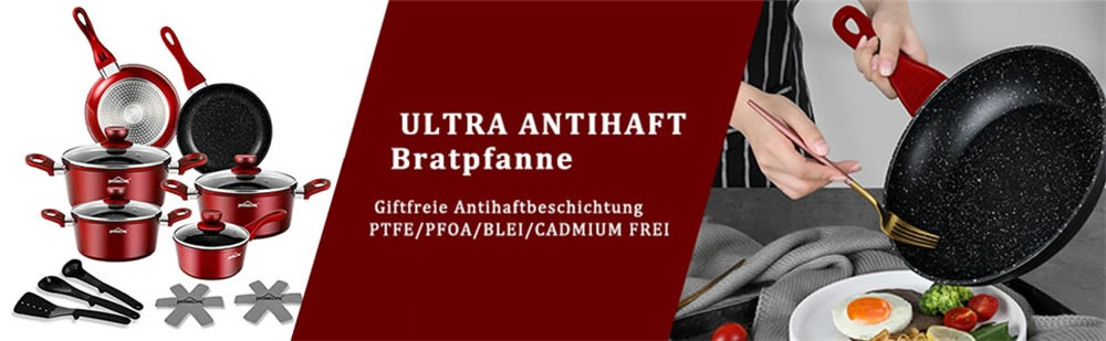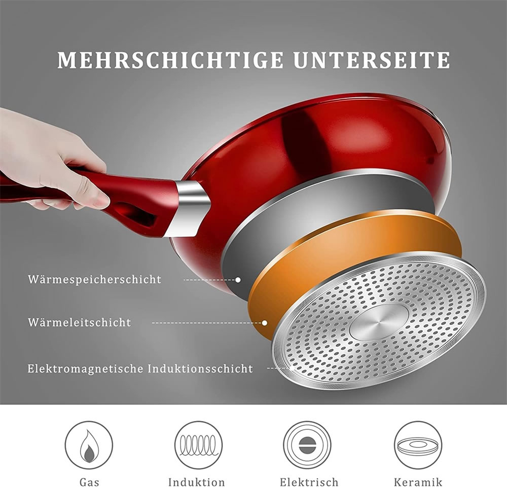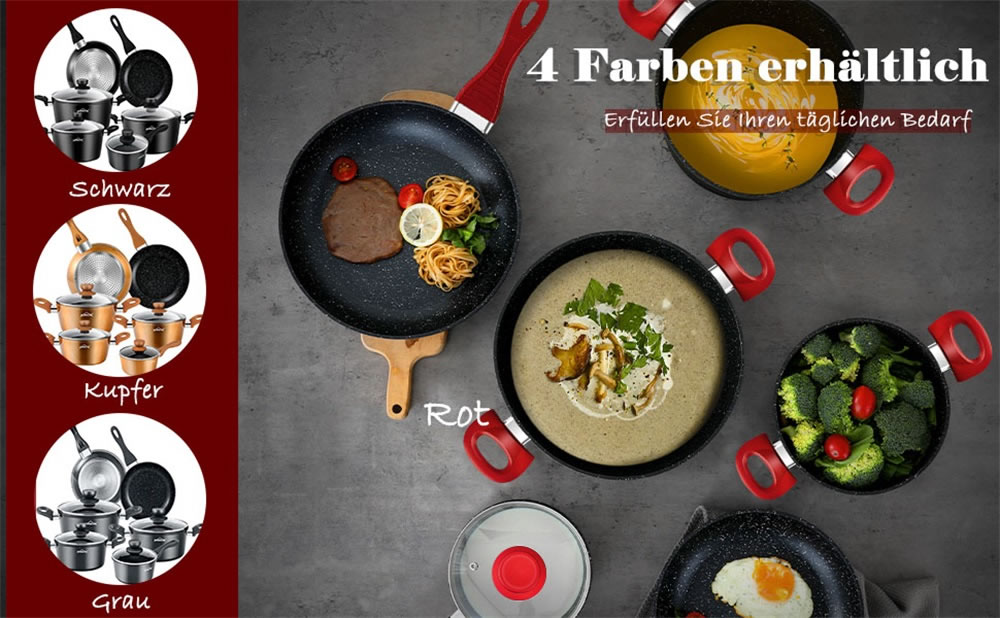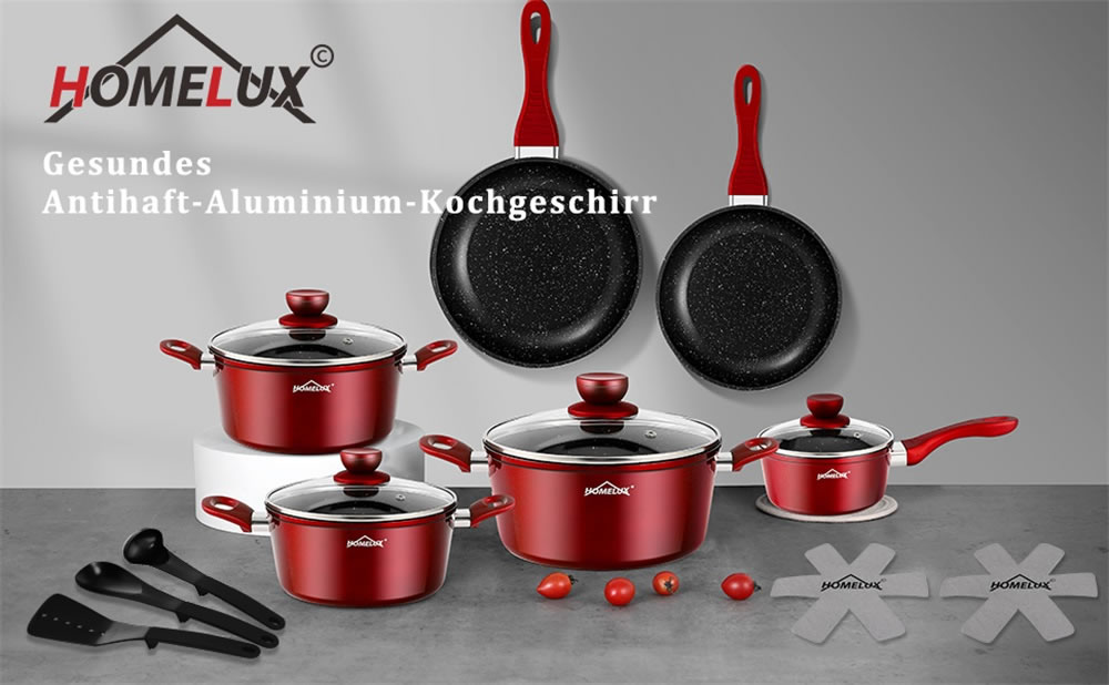 Homelux Topfsets verfügen über eine langlebige und effiziente Antihaftbeschichtung auf der Innenseite, die zu 100% frei von PFOA, PFOS und anderen giftigen Chemikalien ist.Sie können gesündere Gerichte mit weniger Öl oder Fett genießen. Sie können bequem gesunde Mahlzeiten für Ihre Familie zubereiten und das Kochgeschirr mühelos reinigen. (Für die langfristige Verwendung des Topfes wird Handwäsche empfohlen)