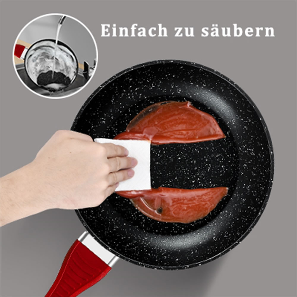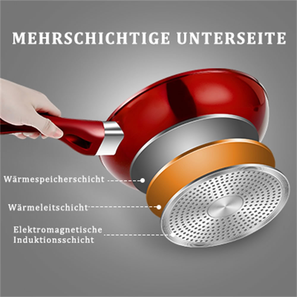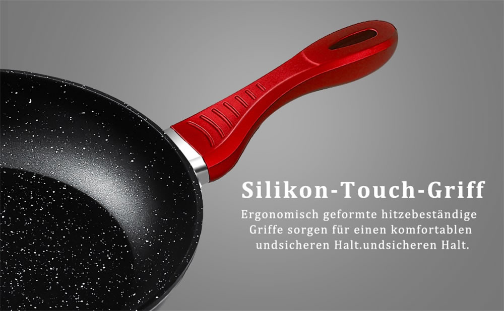 Jede Pfanne außer der Bratpfanne hat einen stabilen belüfteten Glasdeckel, und der hitzebeständige Deckel aus gehärtetem Glas erleichtert die Überwachung des Kochfortschritts. Das professionelle Pfannenset für den Haushalt verfügt über ergonomische und hitzebeständige Cool-Touch-Griffe für bequemes und sicheres Kochen, sodass Sie jede Pfanne sicher in der Küche bewegen können, ohne sich die Hände zu verbrennen.