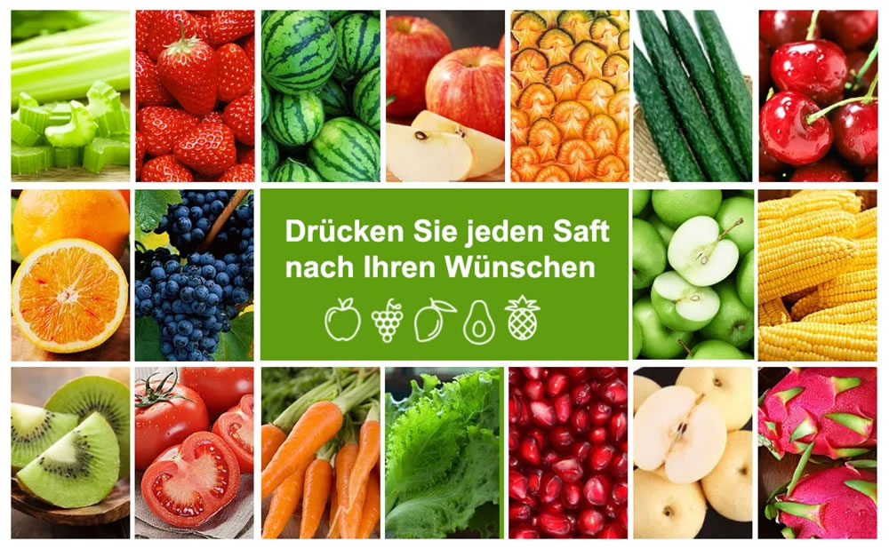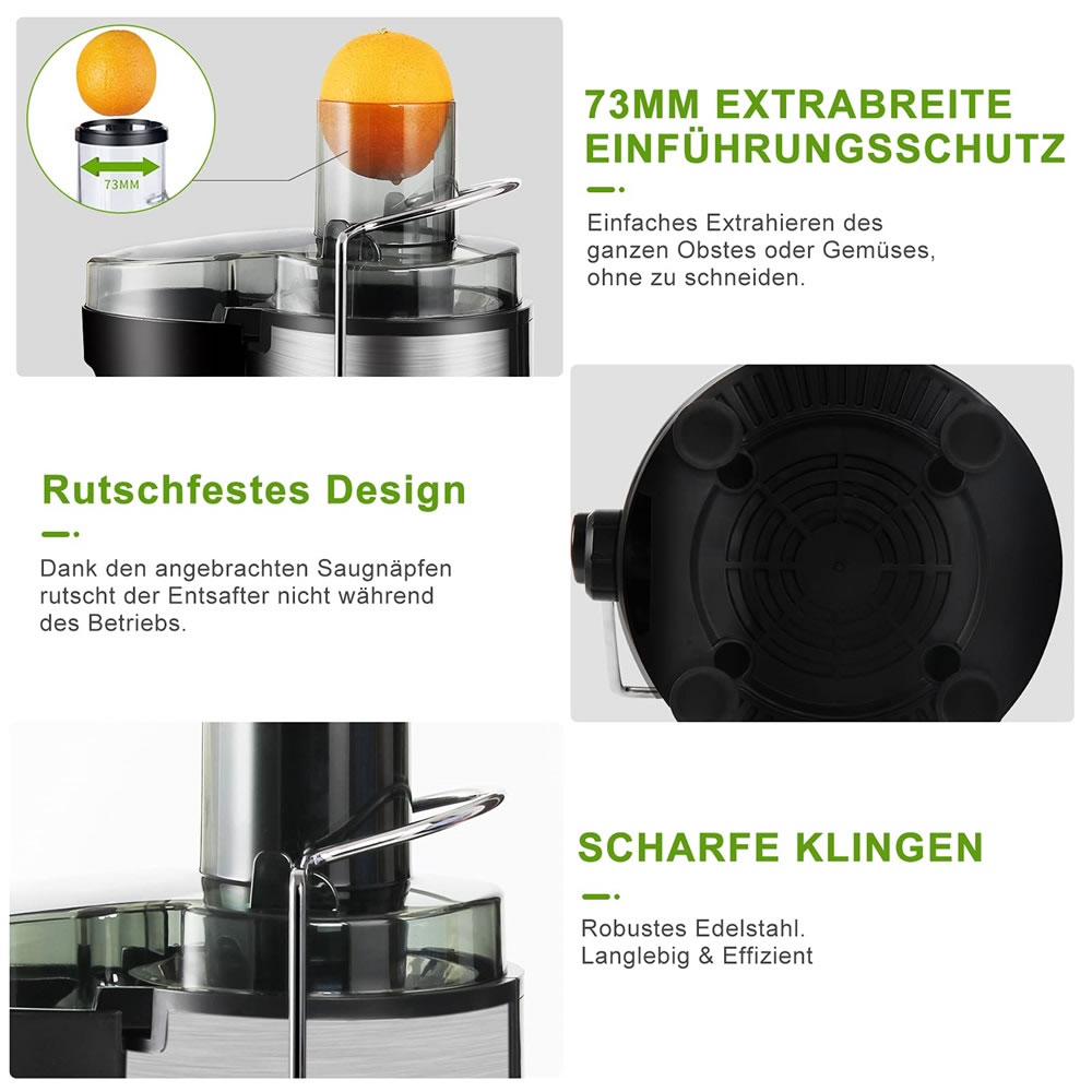Die juicer machine hat einen großen Durchmesser von 73 mm, der alle Früchte oder Gemüse direkt verarbeiten kann. Die scharfe Klinge und der Hochdichte Filter können Fruchtfleischrückstände und Saft direkt trennen, was die Reinheit des Saftes erheblich verbessert!