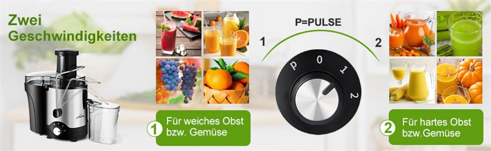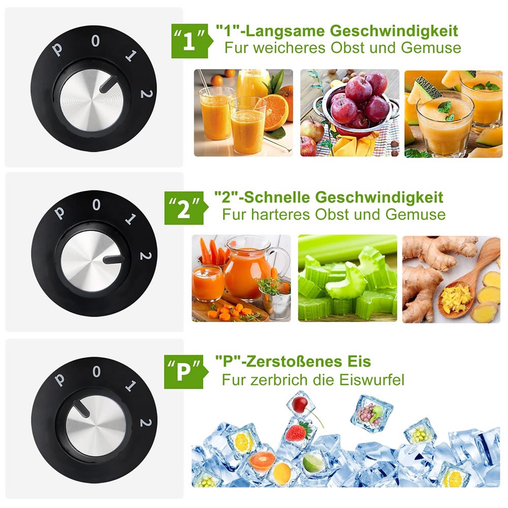 Entsafter elektrisch mit leistungsstarkem und leisem Motor bietet zwei verschiedene Geschwindigkeiten zur Auswahl ""Ⅰ"" niedrige Geschwindigkeit, für weiche Früchte wie Orangen, Tomaten und andere; ""Ⅱ"" schnelle Geschwindigkeit, für harte Früchte wie Apfel, Karotte, Grünkohl und andere. Die Pulsfunktion zerkleinert den Kern von Obst und Gemüse und die Ernährung ist reichhaltiger