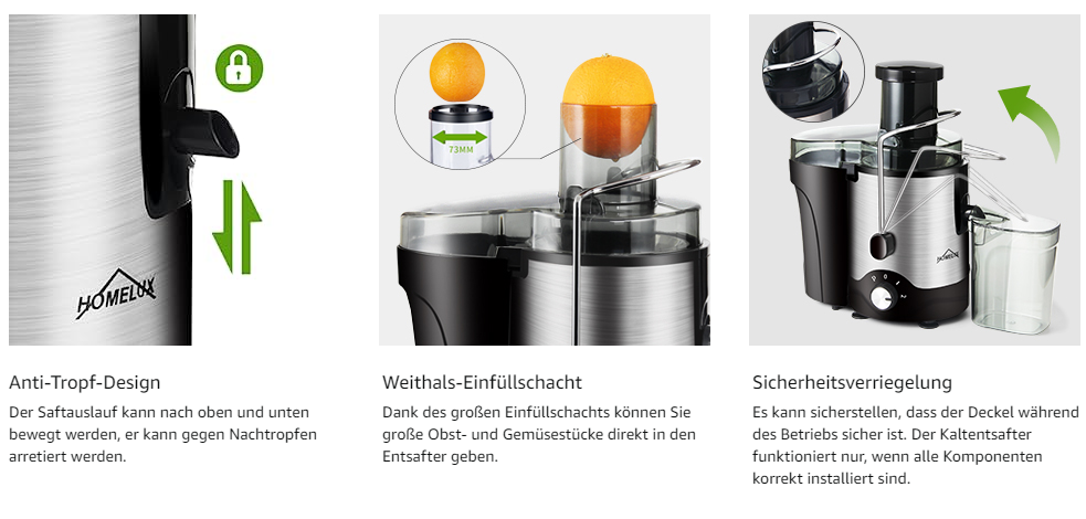 Der Zentrifugalentsafter ist mit einer Sicherheitsverriegelung ausgestattet, um sicherzustellen, dass der Deckel während des Betriebs sicher ist. Der Kaltentsafter funktioniert nur, wenn alle Komponenten korrekt installiert sind. Rutschfeste Gummifüße machen den Saft presse sicherer und stabiler im Betrieb als andere Gemüsepressen. Der Entsafter ist aus hochwertigem Edelstahl, langlebig und sicher genug.