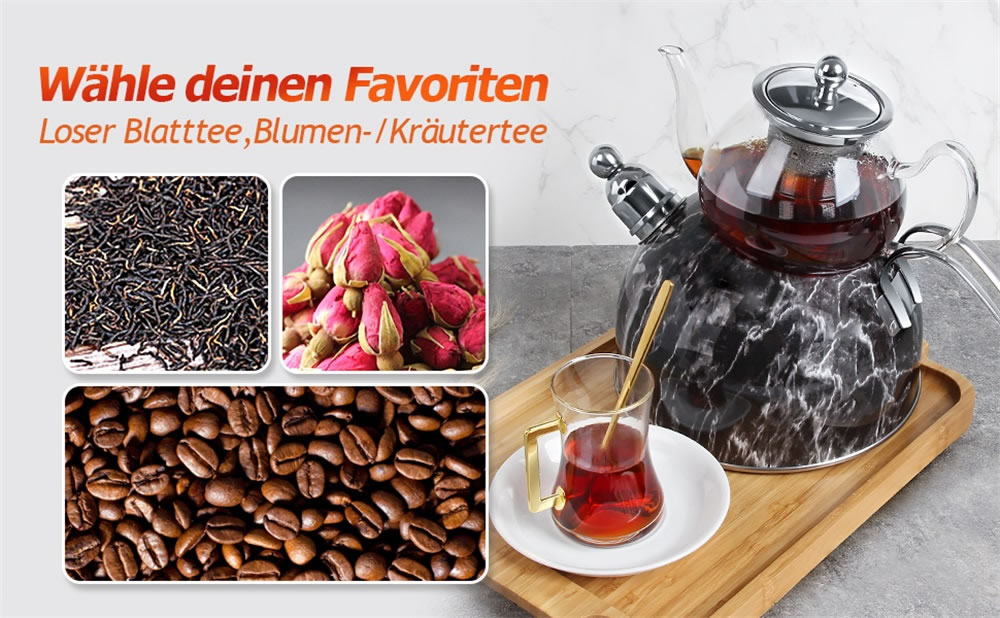 Teekanne türkisch mit ergonomischem Verbrühungsgriff bietet einen bequemen Griff und verhindert Handverbrennungen. Der Ausguss der Glaskanne ist in Form eines Schwanenhalses für müheloses Ausgießen und präzise Kontrolle gestaltet. Teekanne Set ist leicht zu reinigen, spülmaschinenfest oder von Hand zu reinigen.