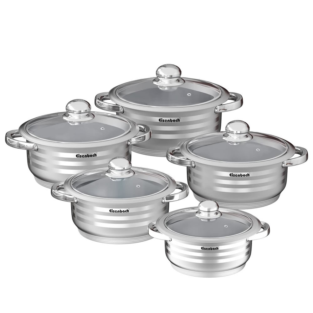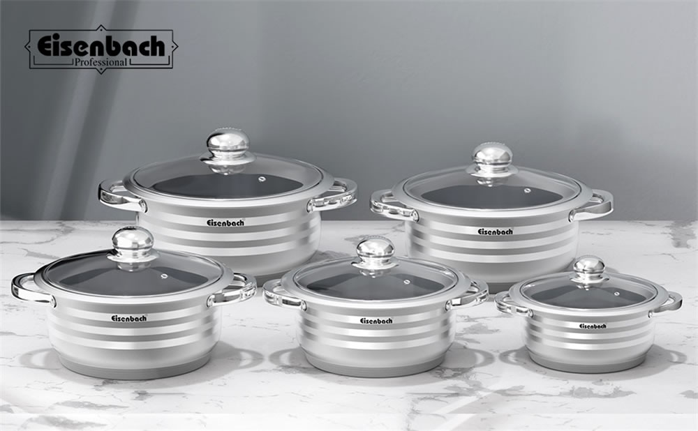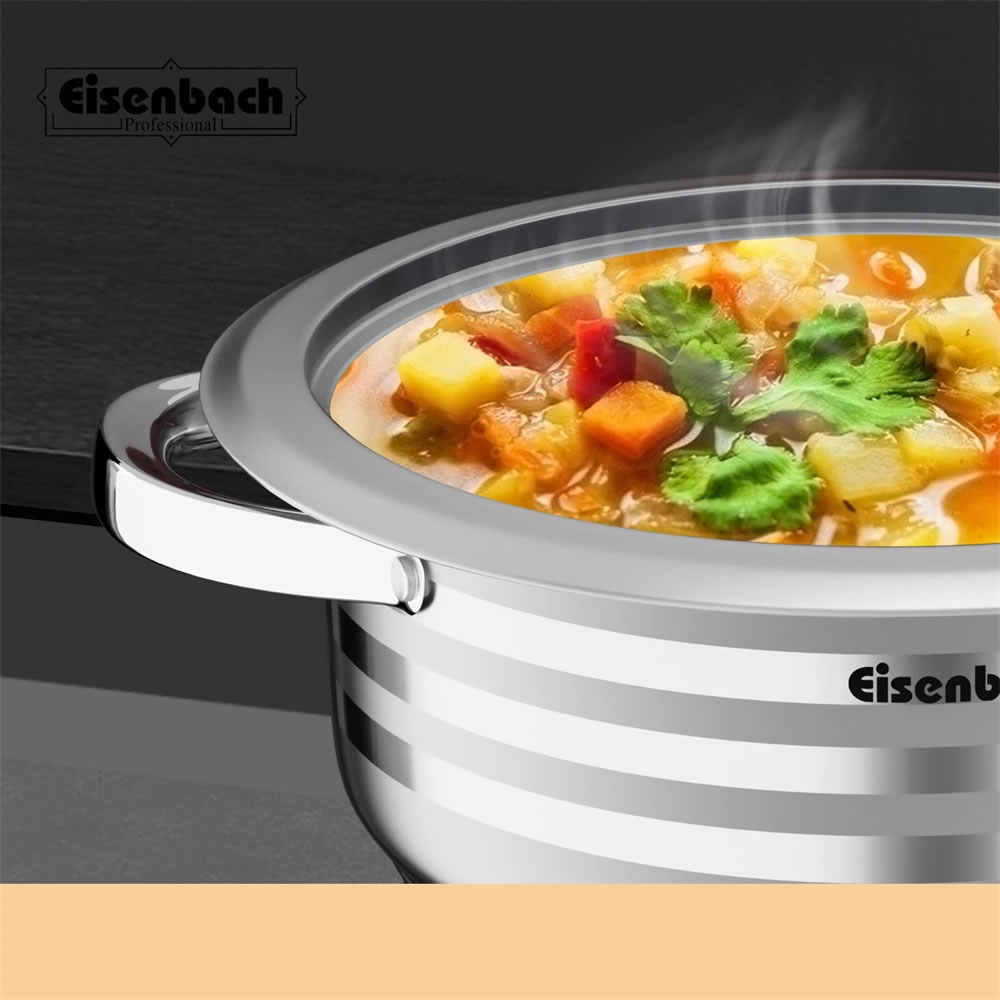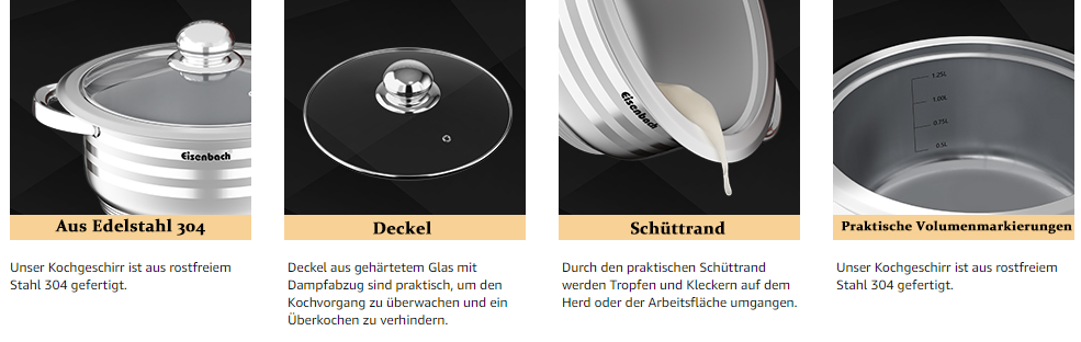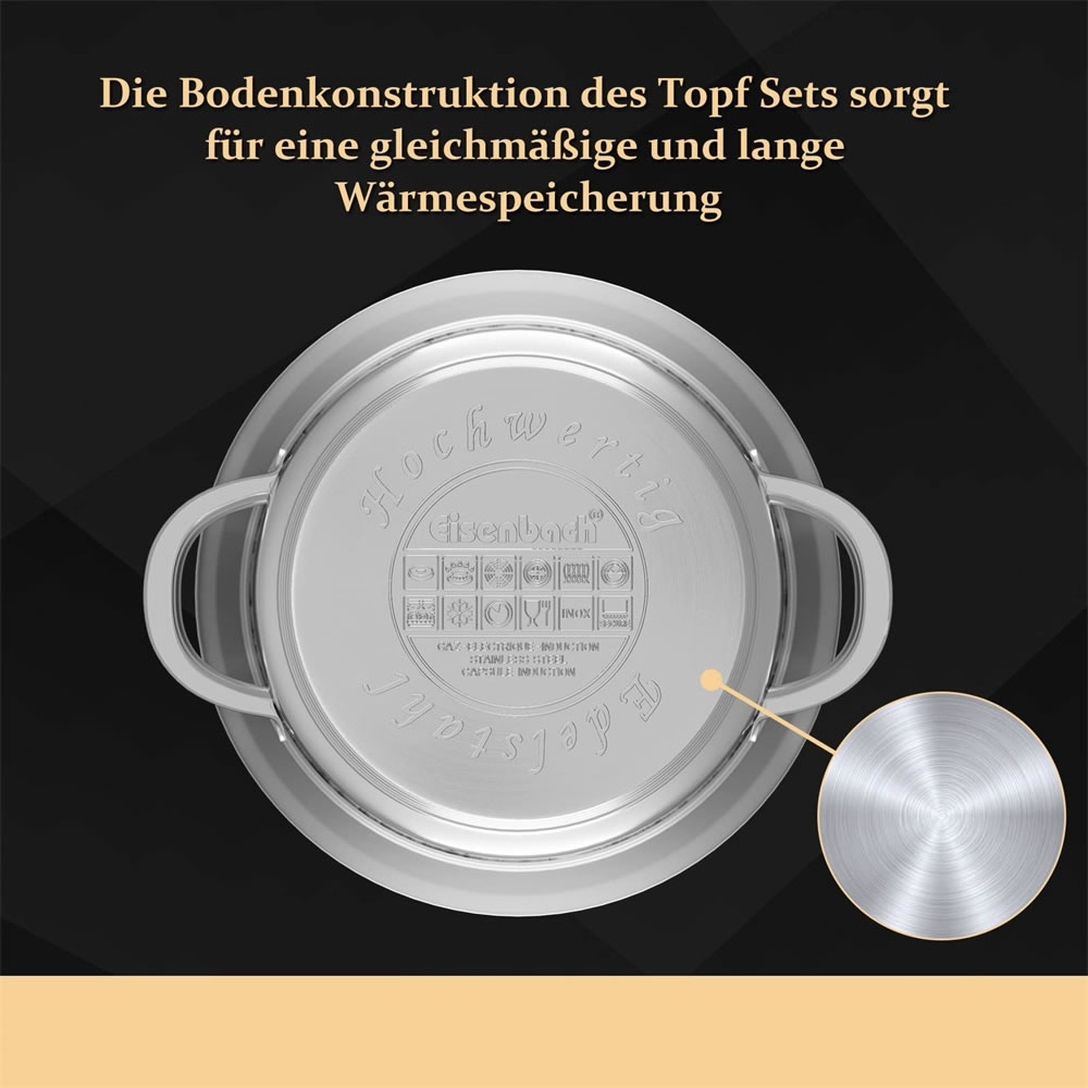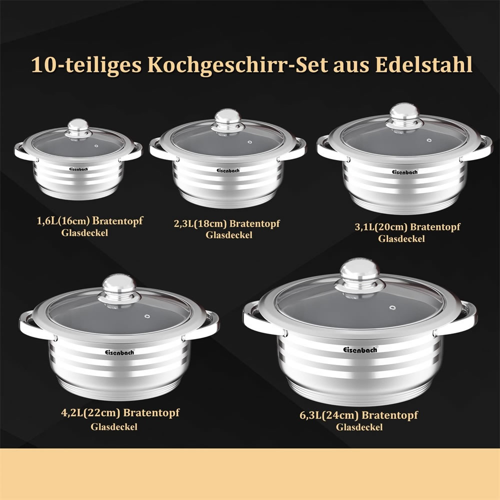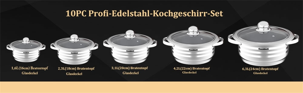 Dieses 10-teilige Edelstahl-Topf- und Pfannenset beinhaltet einen 4x Bratentopf mit Deckel 16cm (V 1,6l),18 cm (V 2,3l), 20cm (V 3,1l),22cm (V 4,2l),24cm (V 6,3l). Mit den Kochgeschirr-Sets erhalten Sie alles, was Sie zum Kochen brauchen, um die verschiedenen Anforderungen des täglichen Kochens für Sie und Ihre Familie zu erfüllen.