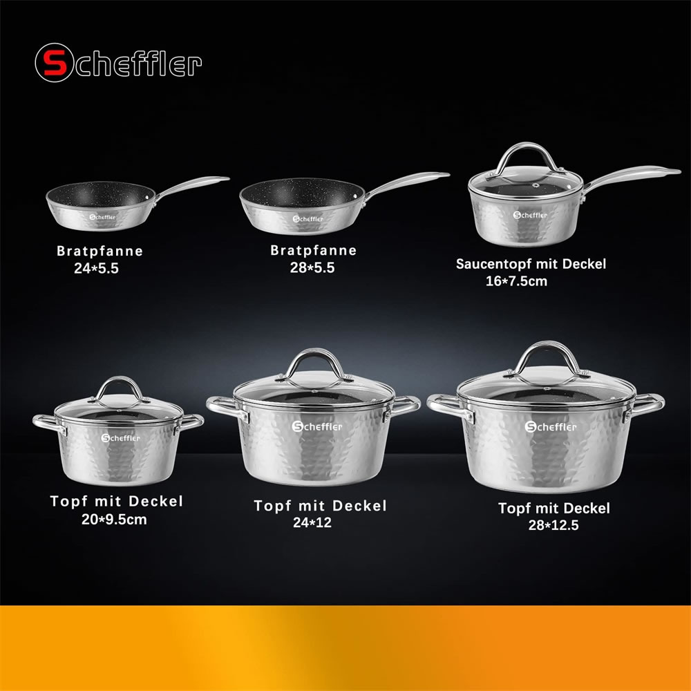 Saucenpfanne mit Deckel Ø 16*7,5cm | Suppentopf mit Deckel Ø 20*9,5cm | Suppentopf mit Deckel Ø 24*12cm | Suppentopf mit Deckel Ø 28*12,5cm | Bratpfanne Ø 24*5,8 cm | Bratpfanne Ø 28*6,8 cm, Zubehör X5.