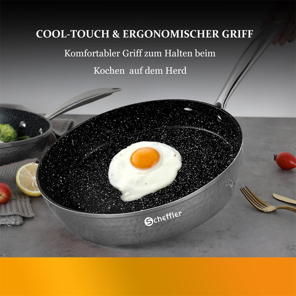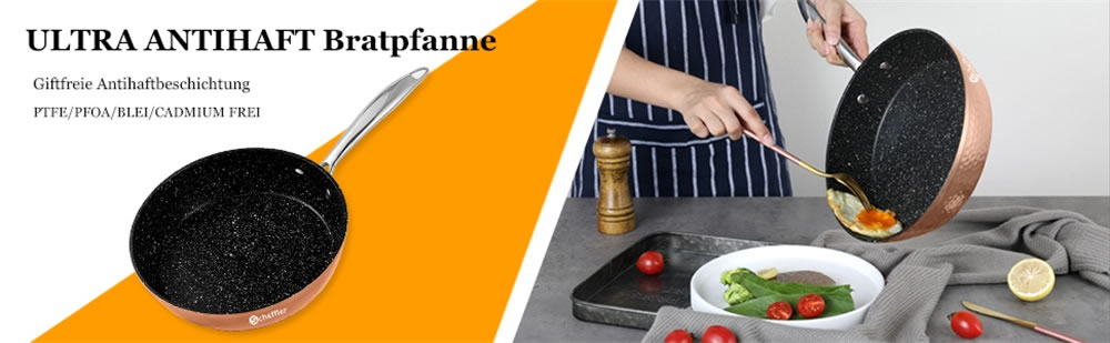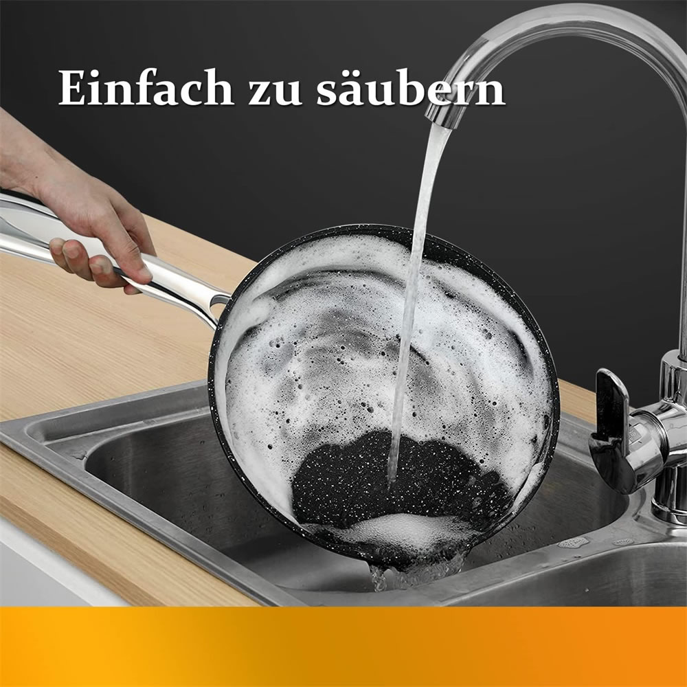 Die Antihaft-Kochfläche ist mit 2x schwarzer Antihaft-Marmorbeschichtung und hitzebeständiger schwarzer Außenbeschichtung beschichtet. 100% frei von PFOA, PFOS und anderen giftigen Chemikalien.