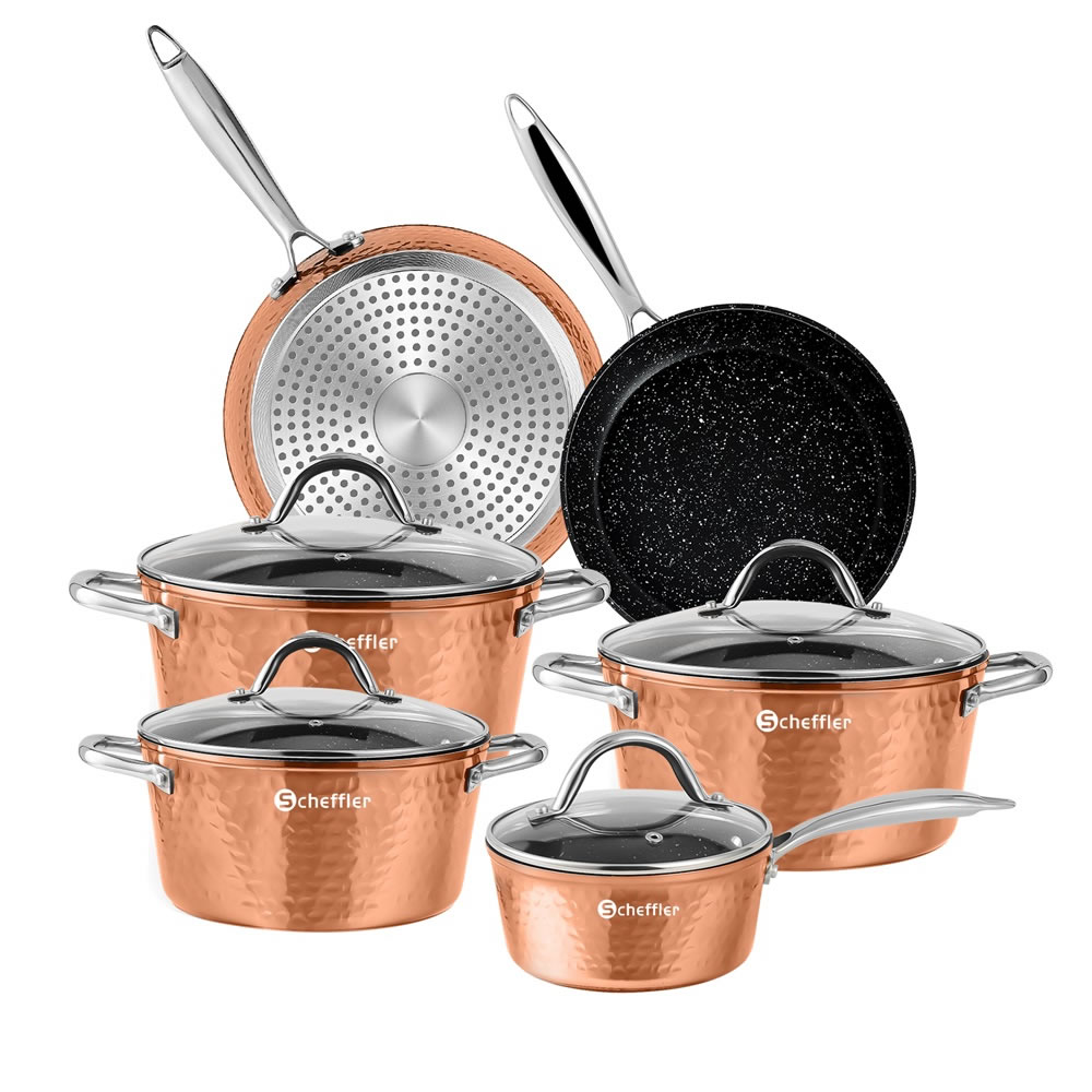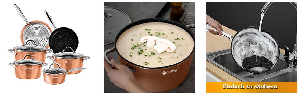 Dieses Topfset Induktion ist sicher für die Verwendung in Gas, Elektro, Antihaft und Induktionszählern. Ergonomische und hitzebeständige Griffe für komfortables und sicheres Kochen.