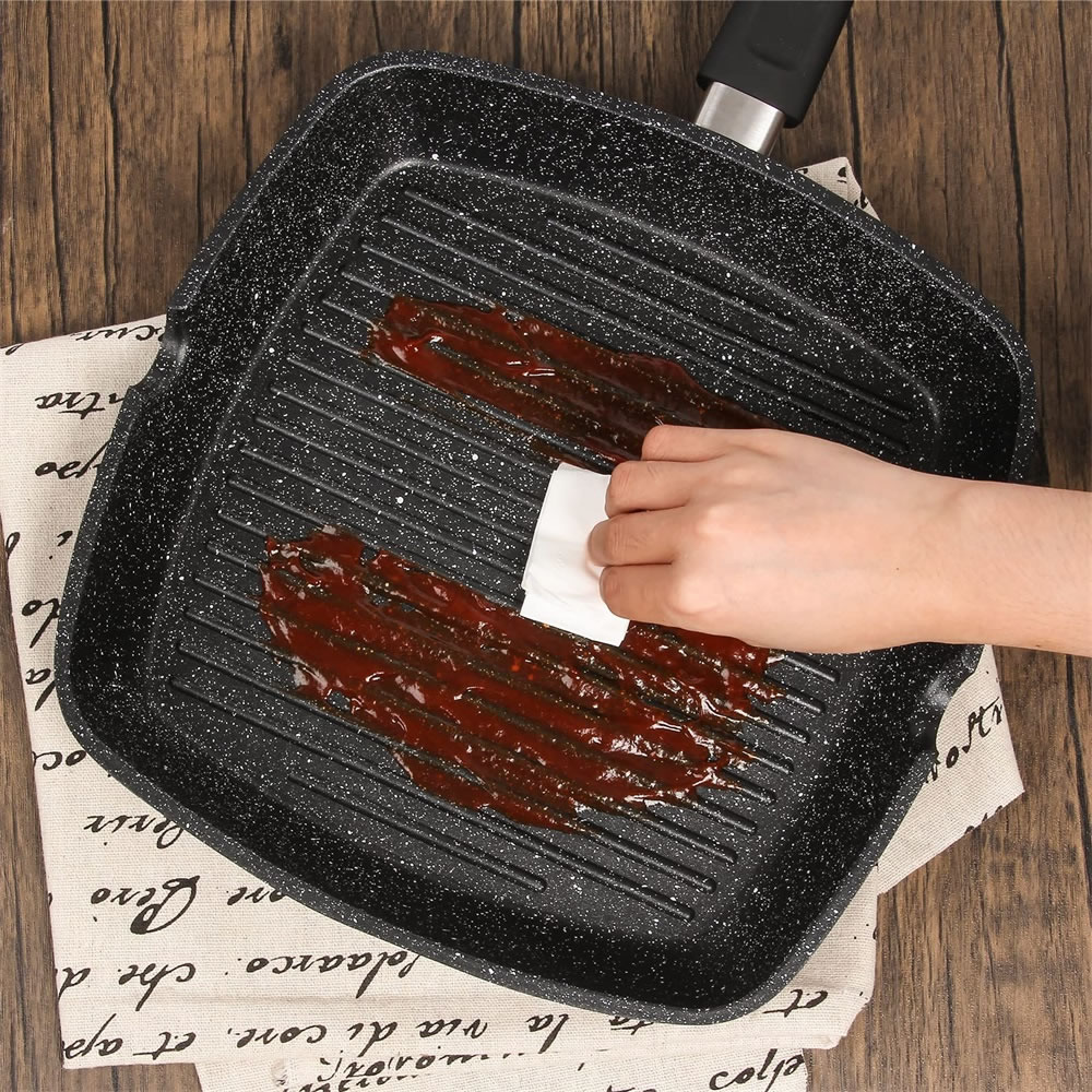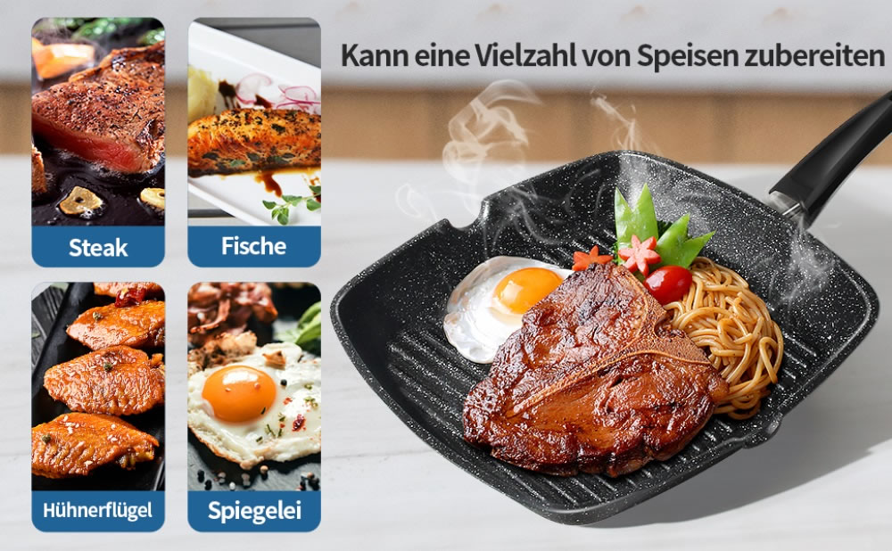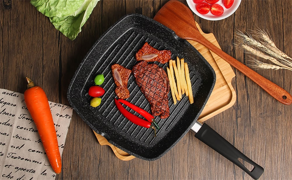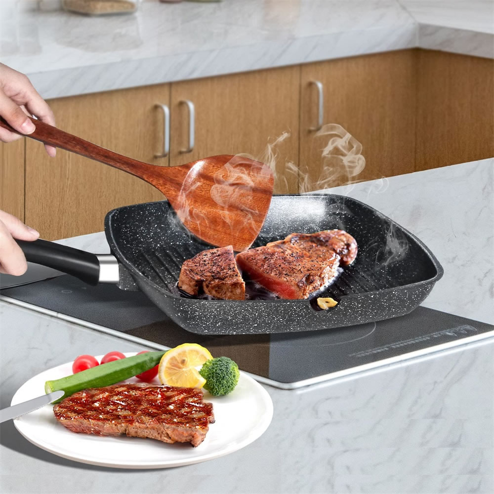 Die quadratische Grillpfanne aus hochwertigem Aluminiumguss mit hervorragender Korrosionsbeständigkeit. 2 mm dickes Aluminiumgehäuse mit entsprechendem Gewicht und Wärmeleitfähigkeit kann eine gleichmäßige Wärmeableitung gewährleisten und heiße Stellen verhindern.
